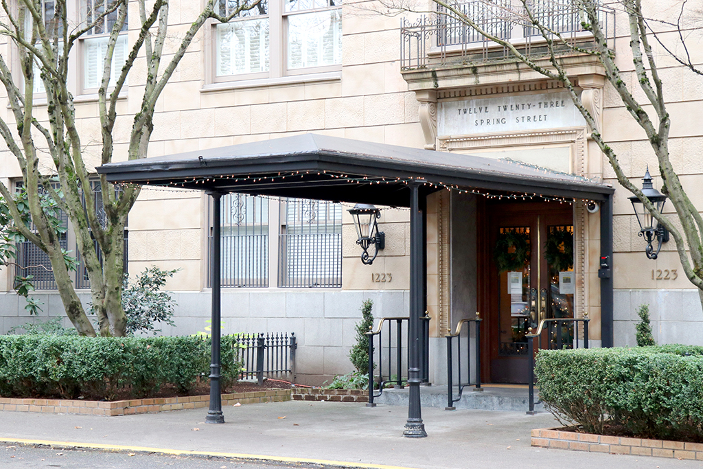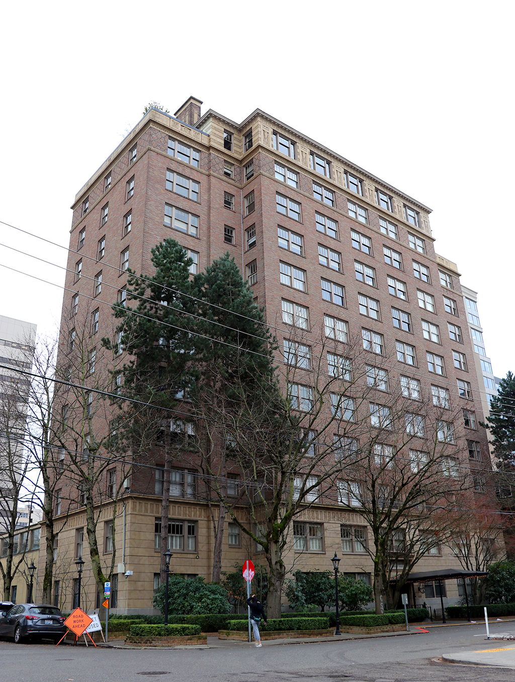 On January 6, 1929, the Seattle Times chronicled the construction of a $580,000 apartment house at 1223 Spring Street that “will be built with a direct appeal to persons of means who are dissatisfied with maintaining large residences in the suburban districts.” The first and second stories are cut stone; the third through eleventh floors have a tawny-colored brick veneer, and the twelfth story is diamond patterned brick, generously adorned with terra cotta. Ornamented terra cotta string courses mark a transition from stone to brick and from plain brick to diamond-pattern. The style reflects a transition from Neoclassical to the popular Art Deco.