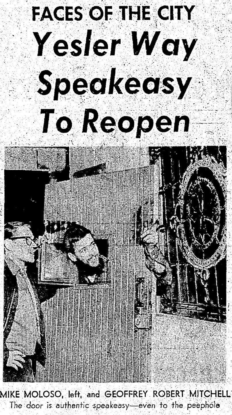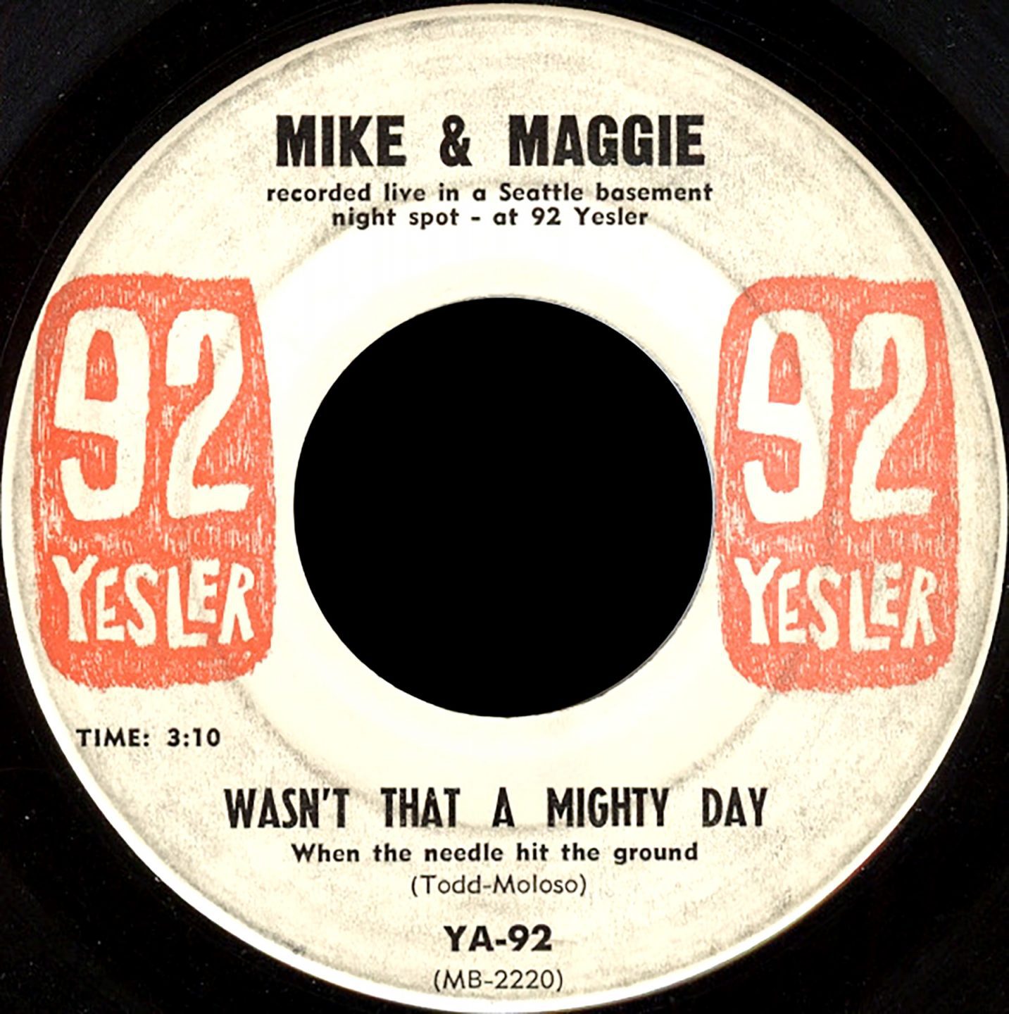 During Prohibition a legendary speakeasy, the Beachcomber Club, moved in, but after a fire in 1943 it reopened as the 92 Club. Then it went quiet for years. In 1961 Bob Mitchell and Mike Moloso rented it and discovered that the original bandshell, tables, and chairs were all still intact. On December 23, 1961, their all-ages pizza-and-coffee folk club, 92 Yesler, opened. Moloso and his wife Margaret – Mike & Maggie — were the regular entertainers, and the room saw plenty of other earnest folk singers and strummers performing their Kingston Trio, Pete Seeger, and Bob Dylan covers for enthusiastic audiences.