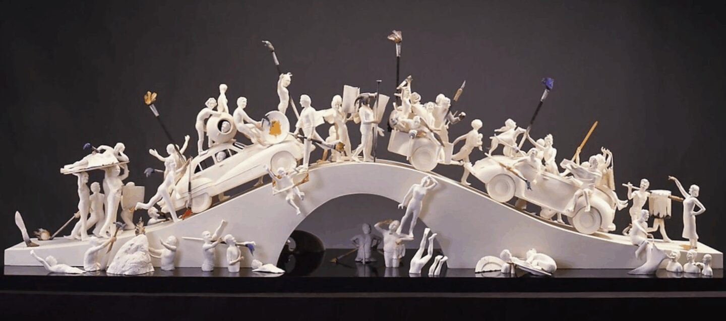 Constructed of low-fire clay, underglaze, glaze, and mixed media, the work depicts a free-spirited group portrait of 71 figures—regional artists, critics, administrators, art technicians known to the artist, and herself—parading over and around a bridge. The “A” in this case is assumed to stand for “art.” In an interview with former Seattle Times art critic Sheila Farr, Warashina described how the idea for the work came together. While on vacation in Mexico with her husband, artist Robert Sperry (1927-1998), they saw a mural by Mexican artist Diego Rivera (1886-1957) that featured many of his friends, along with his wife, artist Frida Kahlo (1907-1954). Warashina thought it was a great idea and wanted to do something similar. She noted that, at the time, “Seattle was just starting to open up with the visual arts and music and theater, so I wanted to do something to celebrate that.”