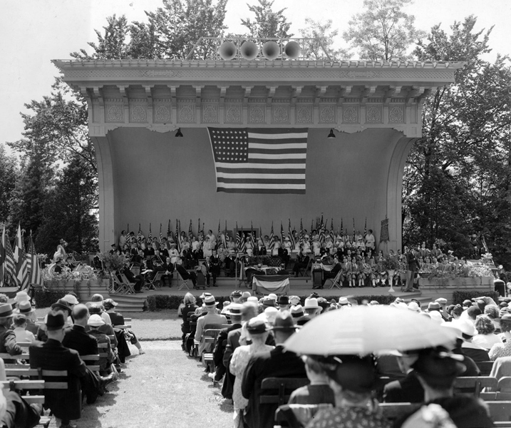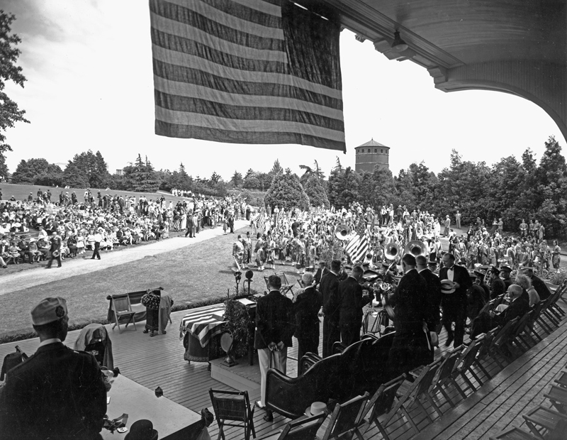 The performing arts have been part of Volunteer Park’s history since the first concert grove was constructed in 1910. The first stage was built where the Seattle Asian Art Museum is located today as part of a pergola structure. Not long after its construction, though, performers began criticizing the bandstand. Olmsted remarked in his field notes that musicians were notoriously hard to please and that he had attended a performance and it sounded just fine to him. Nevertheless, he met with Park Commissioner Edward Cheasty and several other men involved with a symphony to discuss possible locations for a new bandshell. They considered the southwest corner, where the ground had been graded for the playground that would not be built and a small valley in the northwest corner. Neither site appealed to the committee, but a third site, on the north side of the reservoir did. Olmsted objected because it would mar the view across the lawn from the concourse. The idea gained steam and a wooden bandshell was built in 1915 on the lawn where the current amphitheater is today. It was designed by Carl Gould, who would later design the Burke Memorial and the art museum in the park.