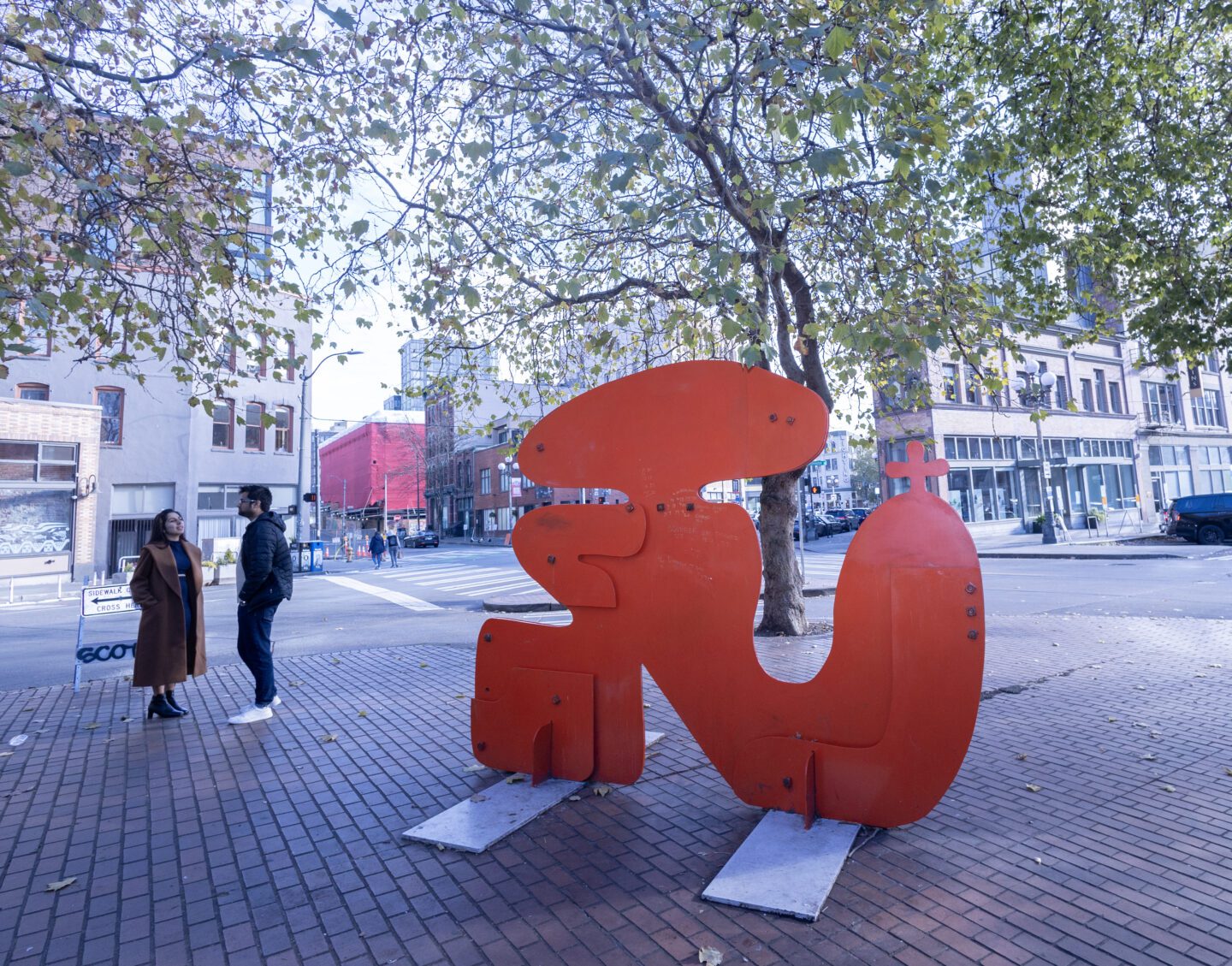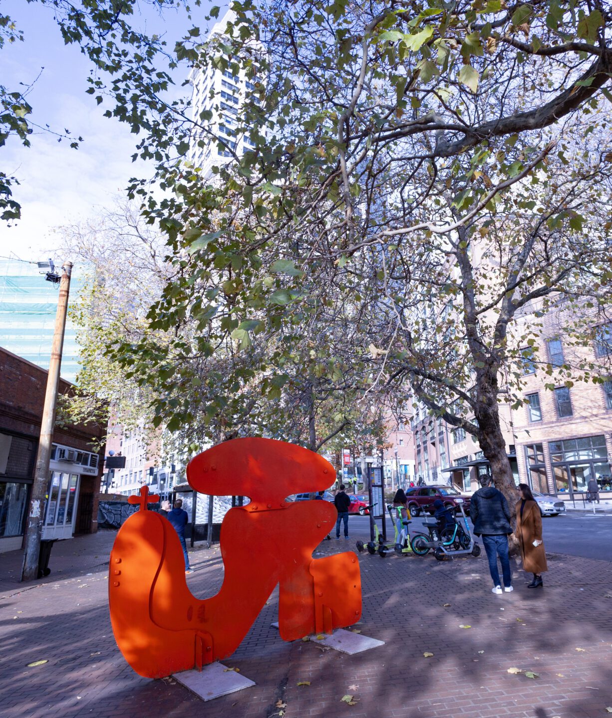 Unlike the pensive works of Pioneer Place Park, Jan Evans’s (b. 1927) abstract, riveted and welded, nine-foot-high steel sculpture, Anawog, can simply be enjoyed for its elegant, fluid shape and its bright “International Orange” color. Evans worked for years as an abstract and minimalist painter before turning her attention to sculpture. Her earlier large canvases were black on white or white on black. Through sculpture, she continued a sense of painterliness, but changed her color palette significantly.