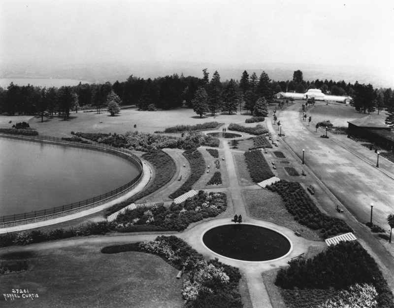 The reservoir forms one axis of the park’s design, with the view across the Sound out to the Olympic Mountains framed by trees planted on the northern and southern sides. It is a great example of a “borrowed landscape” that is often seen in Seattle’s Olmsted parks and boulevards. The distant view is brought into the park and becomes part of visitors’ experiences of the landscape.