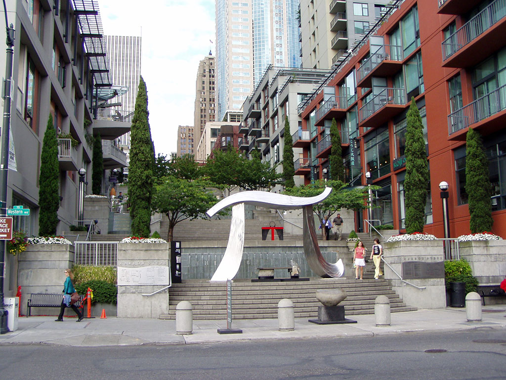 The new Waterfront Park redevelopment includes a new stairwell and elevator at Union Street, completing the connection between 1st Avenue and the waterfront that the staircase between 1st Avenue and Western Avenue has started, and the Overlook Walk connecting the Seattle Aquarium with Pike Place Market.