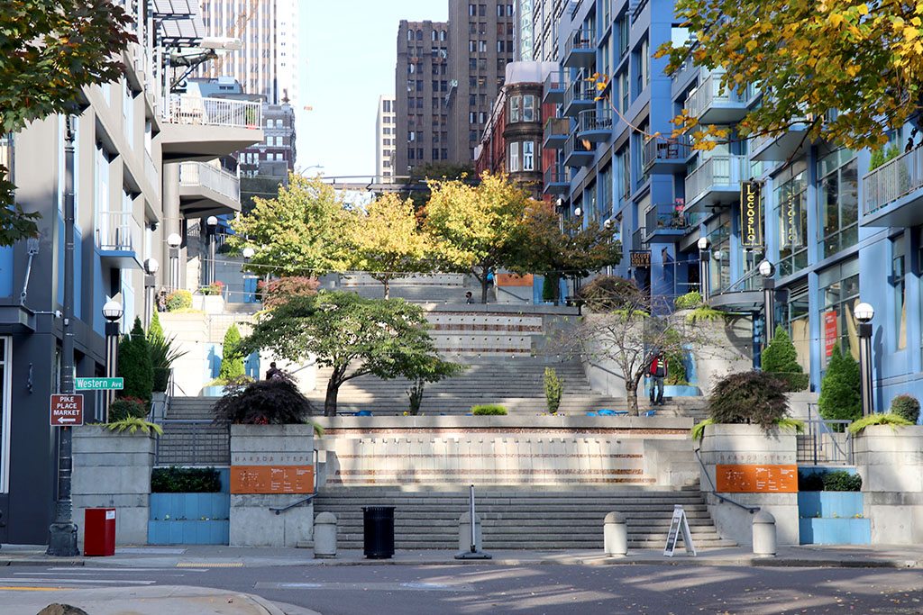 Beginning in the 1970s, as part of the efforts to revitalize the waterfront, the city, port, and private developers created new pathways up the hillside. The Pike Street Hillclimb, completed in 1977, provided a pedestrian route between the Pike Place Market on the bluff and the aquarium and Waterfront Park area along Alaskan Way below. The Harbor Steps development opened in 1994 and, like the hillclimb, incorporated retail, seating, and other amenities to create a corridor of connectivity between the waterfront and downtown. The Port of Seattle’s new Bell Street Pier featured overpasses at Bell and Lenora streets when it opened in 1996.