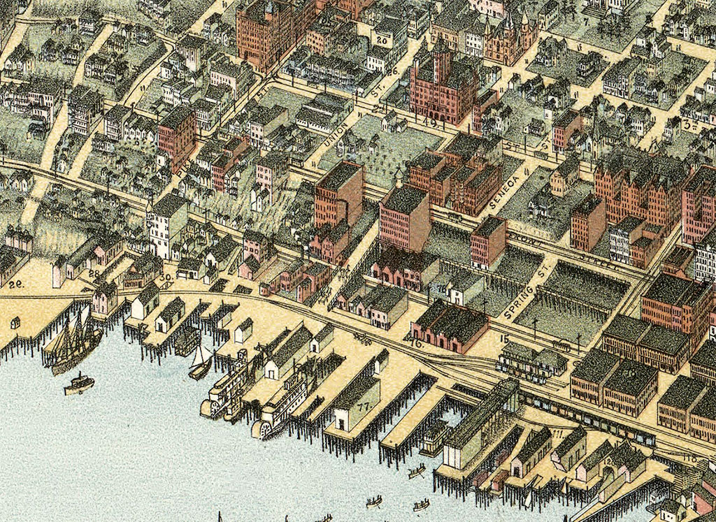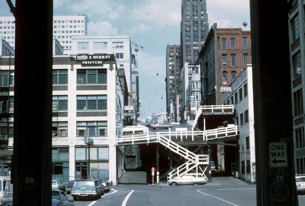One of the challenges of Seattle’s waterfront is the steep hill between the central business district and the shoreline. In the early years, horse-drawn wagons and people on foot used Western Avenue to climb the hill, but that required crossing multiple railroad tracks on Railroad Avenue and taking a long, indirect route. Over time, some staircases, like the one at Seneca Street, were built at some of the street ends between Western Avenue and First Avenue to provide direct, if steep, routes.