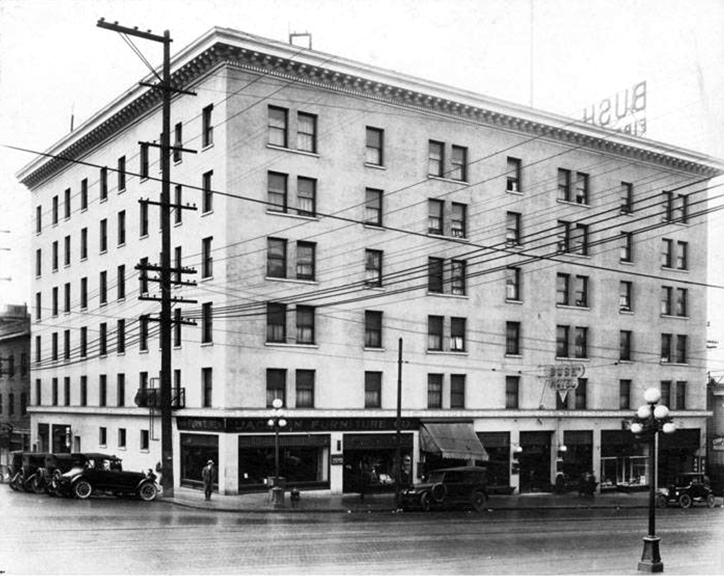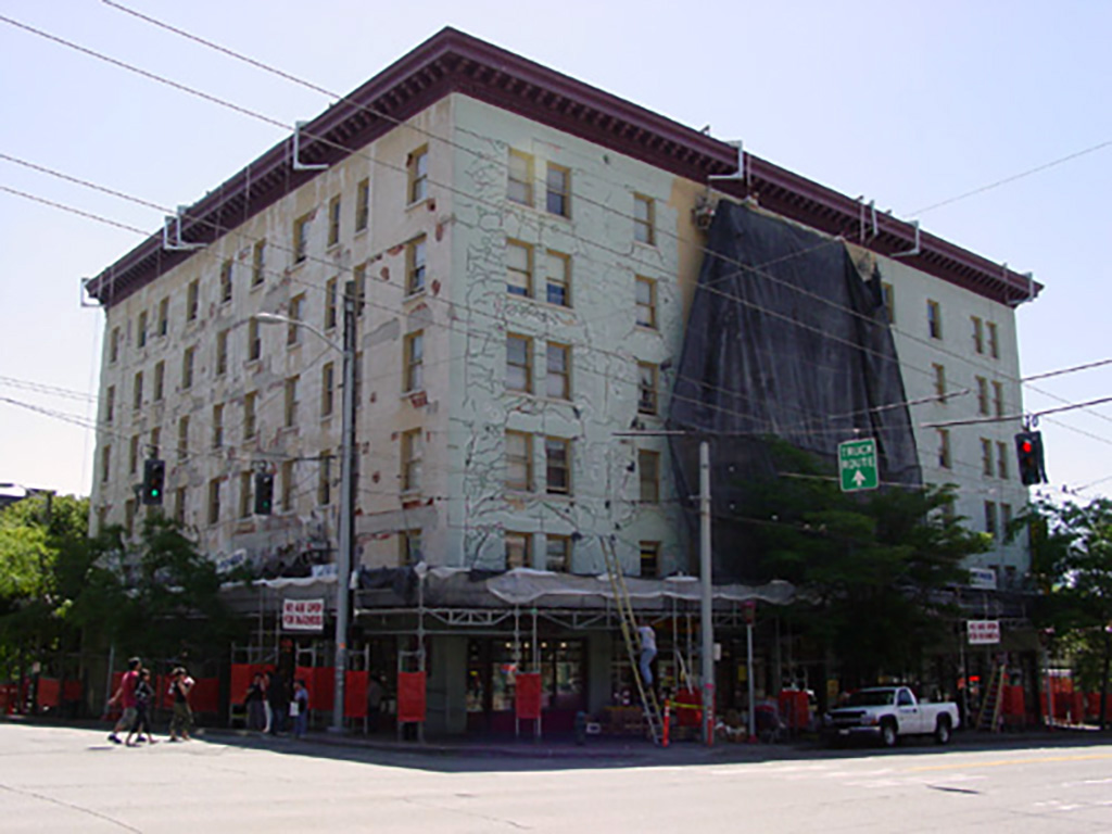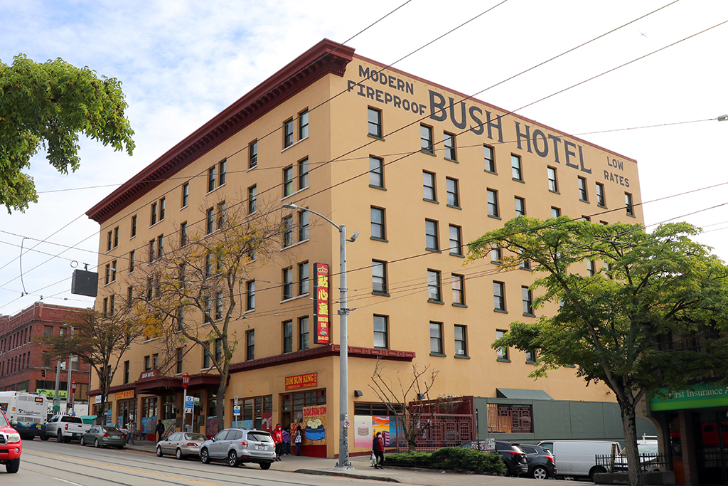 With 255 rooms and 6 commercial storefronts, the Bush Hotel was the second largest SRO hotel constructed in the CID. Only the Hotel Puget Sound (razed in 1992) exceeded its size with 444 rooms and nine storefronts. The Bush Hotel was constructed in 1915 as another architectural commission that was designed by J. L. McCauley for William Chappell. Originally spelled as “Busch,” Chappell named the building to honor his wife, Margaret Busch Chappell. Chappell wanted this SRO to be the grandest hotel west of Chicago and spared no expense in materials or furnishings that included a granite and mahogany registration desk, a phone paging system for guests, cold running water in every room, and two elevators. The building was constructed with three light wells that formed three bays of the building, which provided natural light and air to interior rooms.