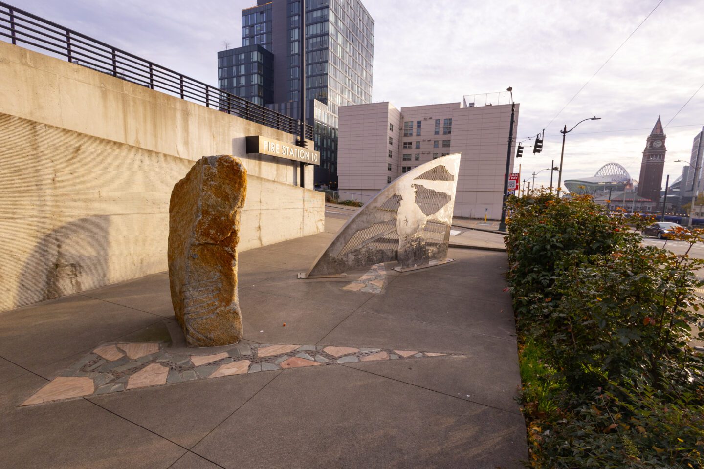 At the corner of 4th Avenue S and S Washington Street, you’ll find Stuart Nakamura’s (b. 1953) three-part work, Call and Response. Nakamura is known for his site-specific artworks inspired by the cultural history, location, and character of the work’s setting, and this one is no exception. For Call and Response, his inspiration came from the fire station’s location on the border between Pioneer Square and the International District, the history of the area, including the locale of the Great Seattle Fire which destroyed the city’s entire central business district in 1889, and the station’s reputation. Fire Station 10 is known throughout the Seattle Fire Department as “The Rock” due to its long tradition of protecting the surrounding communities.