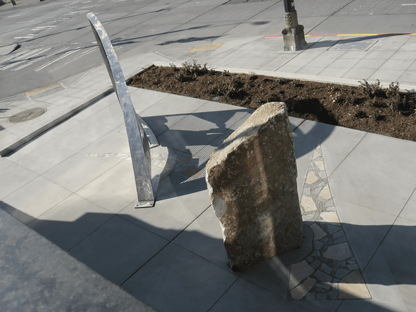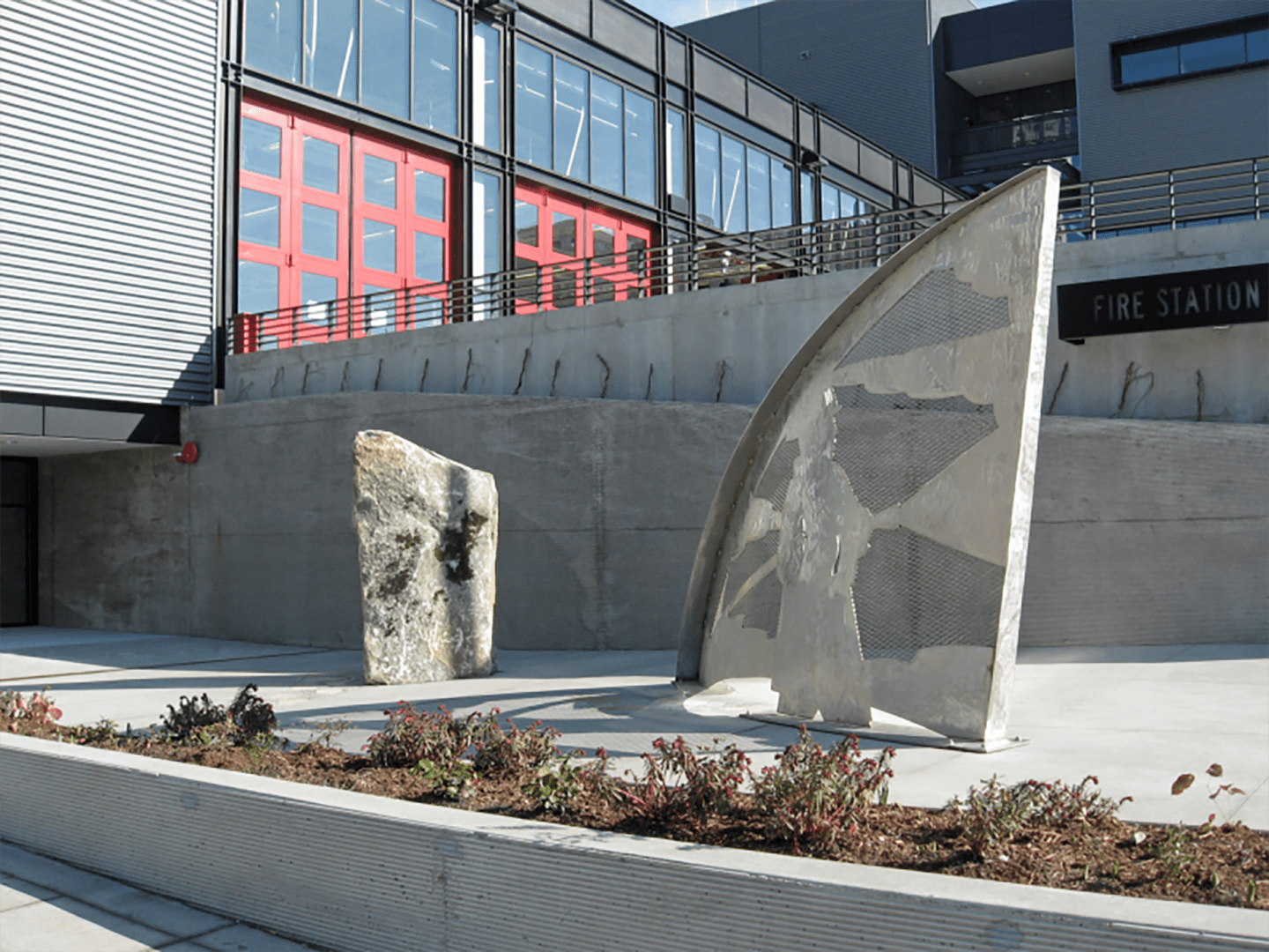 To begin the project, the artist sat down with the station’s firefighters and talked about ideas they’d like to explore in the work. Nakamura learned how their lives are focused on saving people and performing dangerous tasks. He wanted to honor that part of their identities while still satisfying his artistic vision. The result is a work in three parts: a rough-hewn granite boulder etched with lines resembling ripples in water that symbolizes the crew of Station 10, a stainless-steel arc containing the imagery of smoke and a firefighter spraying water from a firehose, and a flagstone inlaid path that makes use of materials from Pioneer Square similar to those used to construct buildings after the Great Fire.