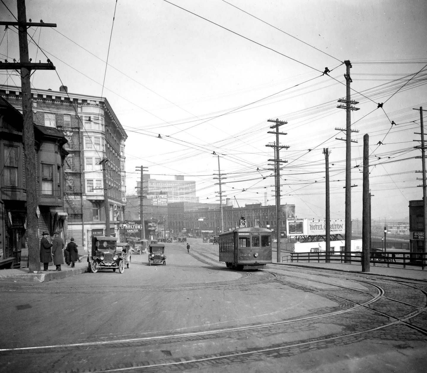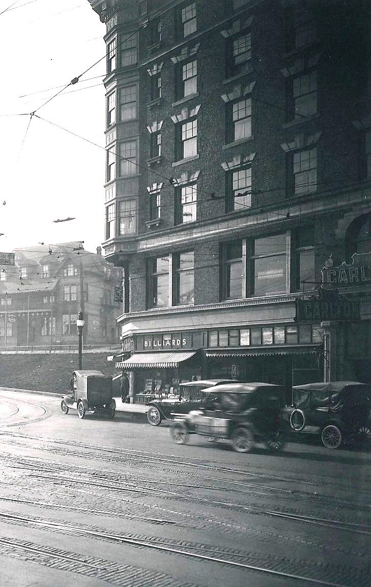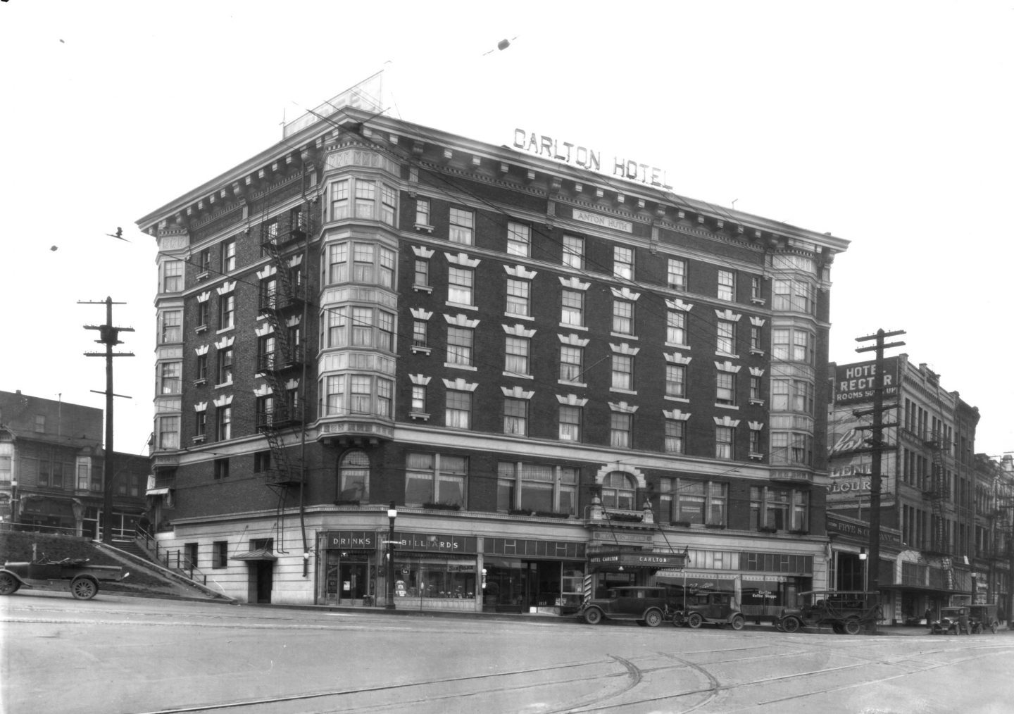 The grand Carlton Hotel was designed by Carl August Darmer for Anton Huth, the man who owned the massive Pacific Brewery. The hotel opened in 1909 in anticipation of the construction of Union Station. It is an interesting mix of construction techniques and technologies, with the frame and floors made of reinforced concrete, the main supports of heavy timber, and the walls of brick, stone, and hard plaster between the projecting bays. The hotel was rehabilitated in the late 1970s, and the once-lavish interior has been replaced with offices.