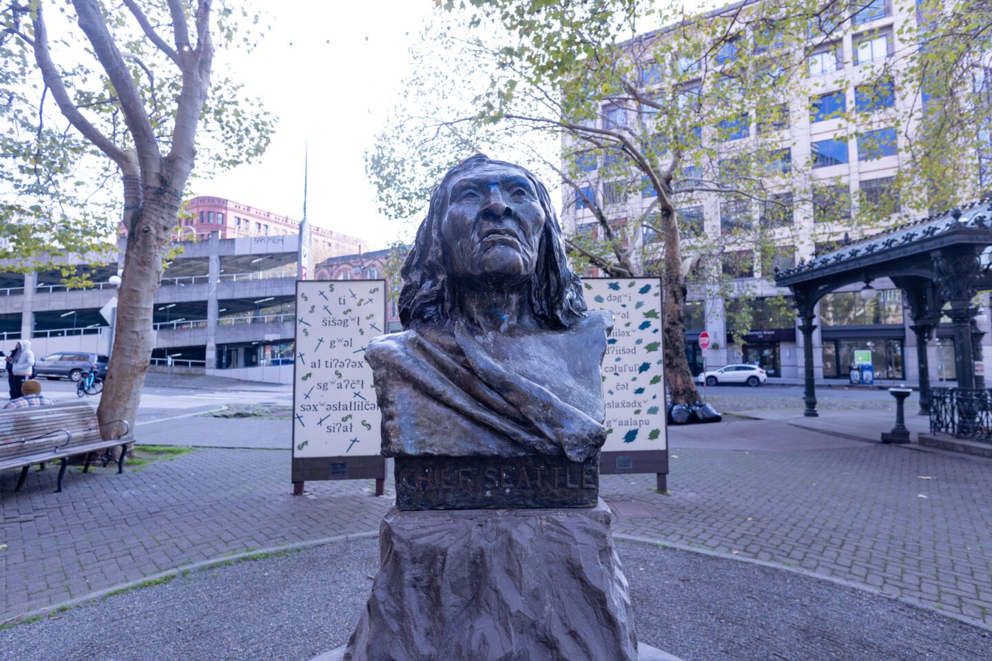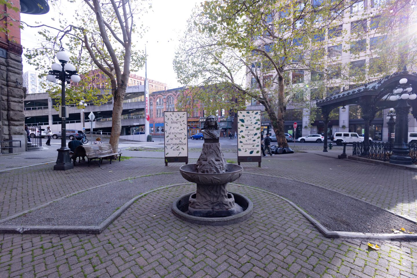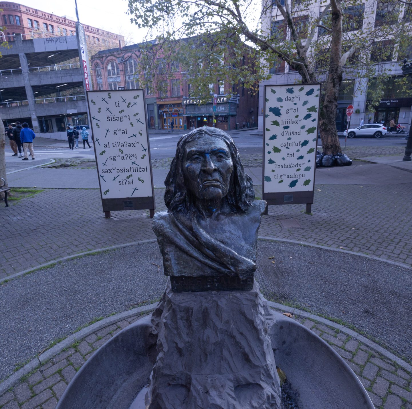 Walking toward the pergola and looking to the left, you’ll find one of the first sculpture of the city’s namesake, Chief Seattle (Si’ahl, ca. 1780-1866), chief of the Suquamish and Duwamish tribes. James Wehn (1882-1973), a classically trained sculptor and the first chairman of the University of Washington’s Sculpture Department, created several sculptures of Chief Seattle, including a life-sized version for Tilikum Place (at Denny Way and 5th Avenue). In anticipation of the city hosting the Alaska-Yukon-Pacific Exposition (1909), the City’s Street and Sewer Department asked Wehn to create a sculptural work as part of a city-improvement endeavor. The result was a bust of Chief Seattle set upon a three-tiered ornamental watering fountain “suitable for man, horse and dog.” Made of bronze, and likely made alongside the life-sized model, Wehn used the only known studio photograph of Seattle, taken in 1865 by the E.M. Sammis photography studio, to create the chief’s likeness. Three castings were made of the bust: this one, a second for Tilikum Place that was later moved to Westlake and 4th Avenue, but vanished, and a third that ultimately ended up at a Renton fire station.