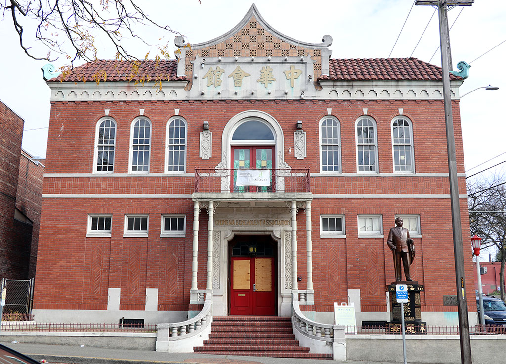 The Chong Wa Benevolent Association, on the northeast corner of the intersection, was founded as an umbrella organization with representative membership comprised of Chinese family and district associations throughout the state, much like the Six Companies in San Francisco. The organization began in Seattle around the turn of the twentieth century but its home in its own building began with its construction in 1930. Wing Sam Chinn collaborated on the design of the building with Max A. van House as the architect of record. Chinn later became the first Asian American graduate in the Department of Architecture from the University of Washington and was the first licensed Asian American architect in Washington state.