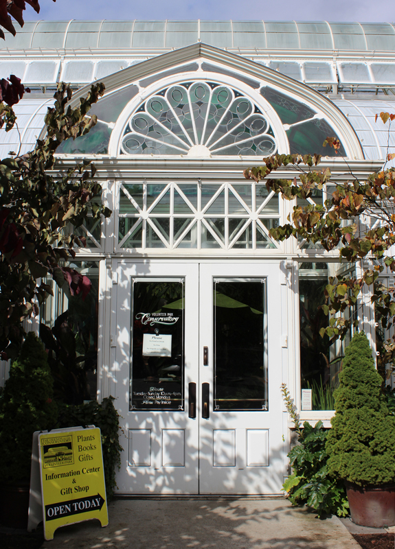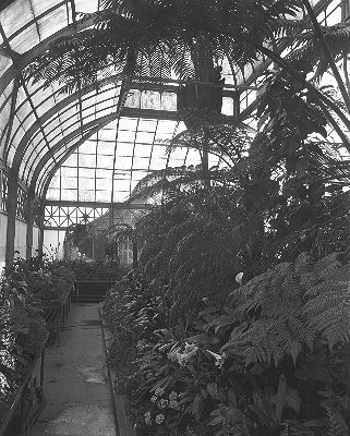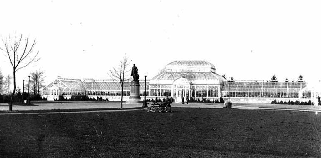 Constructed in 1912 from a pre-fabricated kit from the Hitchings Company of New Jersey. It consists of five rooms. The domed section at the center is the Palm House. Not long after the conservatory was erected, Anna Clise donated her orchid collection. This formed the nucleus of the orchid collection and inspired others to make similar donations. Fern House and Bromeliad House are on the west. To the east, the Seasonal Display House is now located where the original Cyclamen House was found. The east wing also holds the Cactus House. The distinctive window over the front entry is known as a lunette or peacock window and is original to the building.