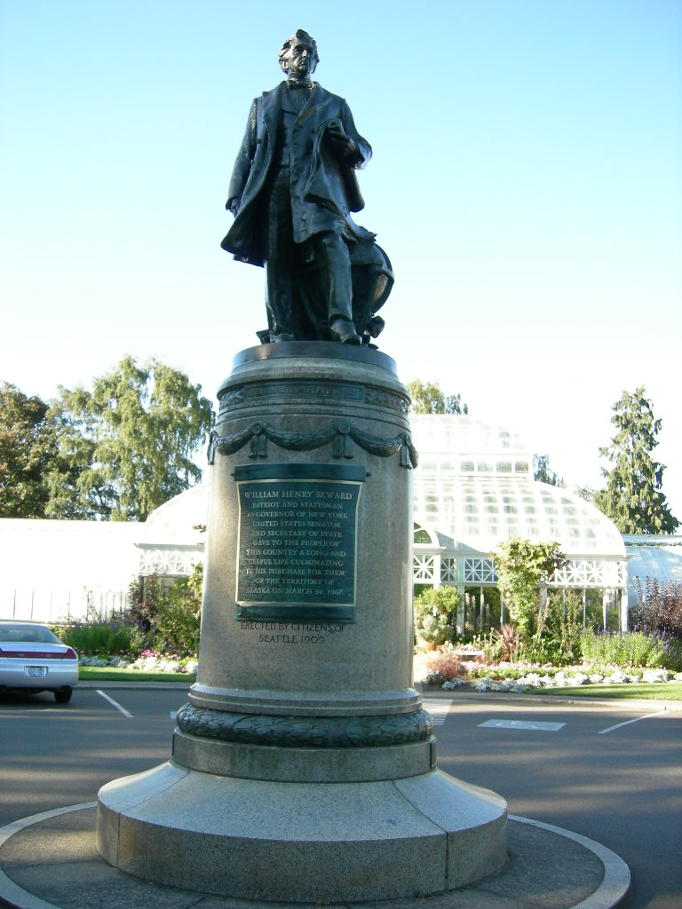 The Seward statue in the center of the traffic circle in front of the Conservatory was first placed at the University of Washington campus for the 1909 Alaska-Yukon-Pacific Exposition. It honors William Henry Seward, who was the Secretary of State responsible for the purchase of Alaska from the Russians. The statue was moved to Volunteer Park after the exposition was over in the fall of 1909. It was the first of many memorials and monuments in the park.