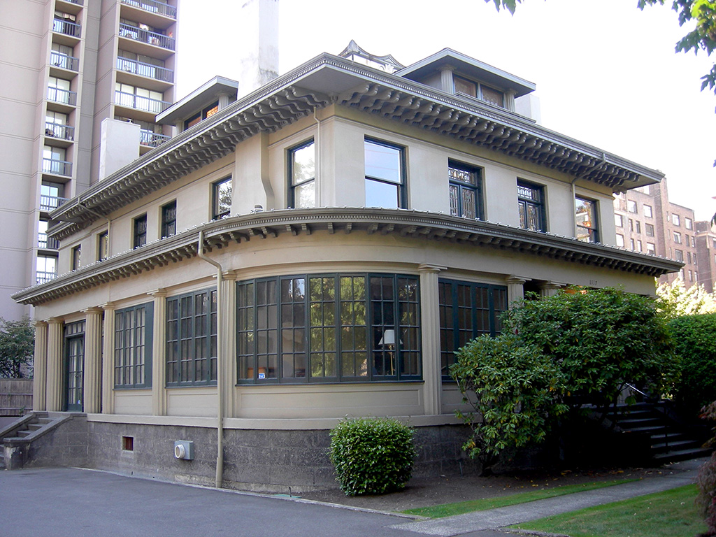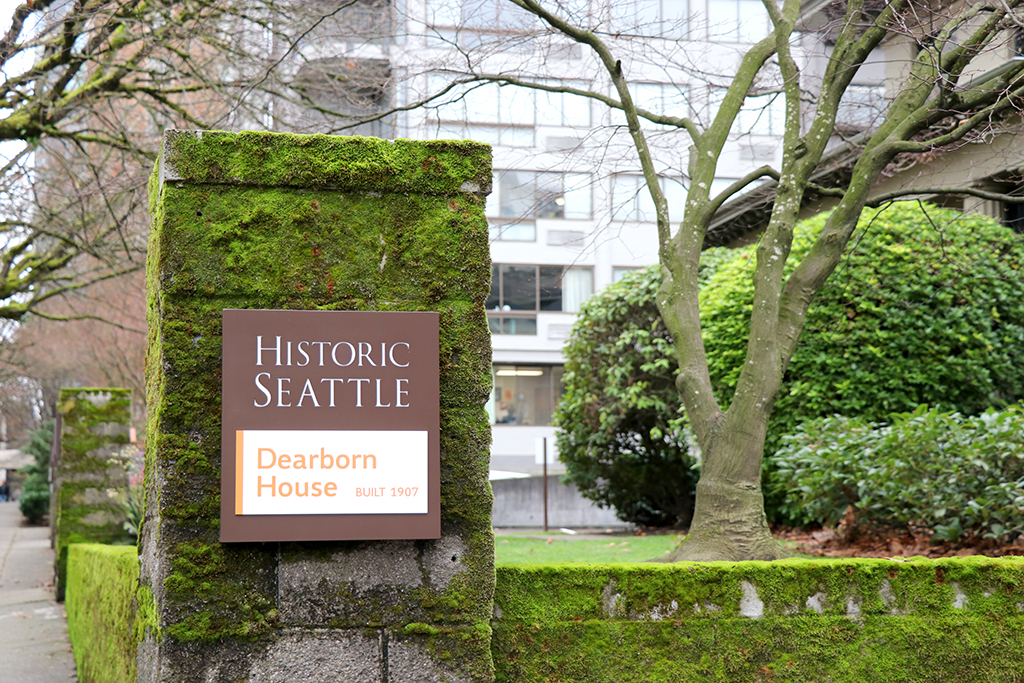 Three of the four bedrooms and one bathroom on the second floor have double-leaf French doors with glazed panels and transoms of Prairie School inspired art glass. The thematic motifs are stylized tulips in gold and green that appear in several variations throughout the house. The building had been used for medical offices from 1953 until its purchase by Historic Seattle in 1997. It now houses the offices of this non-profit membership historic preservation organization. The Dearborn House is a Seattle Landmark and listed in the National Register of Historic Places.