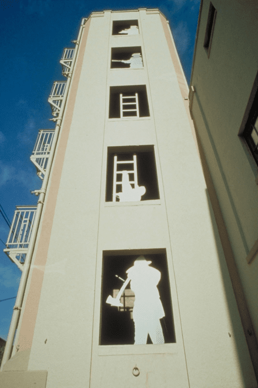 Like the public art at Fire Station 10, the works here were also the result of a city-wide funding initiative. Spokane-based artist Tom Askman (b. 1941) created Firefighter Silhouettes as part of a voter-approved bond issue in 1984 that funded the renovation of 16n fire stations and included a public art component. Askman was part of a team of three artists, including Kenny Schneider and Ellen Ziegler (b. 1949), who selected five stations from the group in which to make work. The group’s stated goal was to acknowledge the bravery of Seattle’s firefighters. Fire chiefs, city administrators, and arts committees worked together to approve the final work. The opinions of the firefighters living in the station factored into the selection process. Firefighter Silhouettes were designed at Askman’s Enigma Art Co. (later Enigma Lake Art Co.) in Spokane, where he created other public works for fire stations across the country. As part of the same 1984 bond issue, Askman produced a second, but very different, set of Firefighter Silhouettes for Seattle’s Fire Station 17 in the University District.