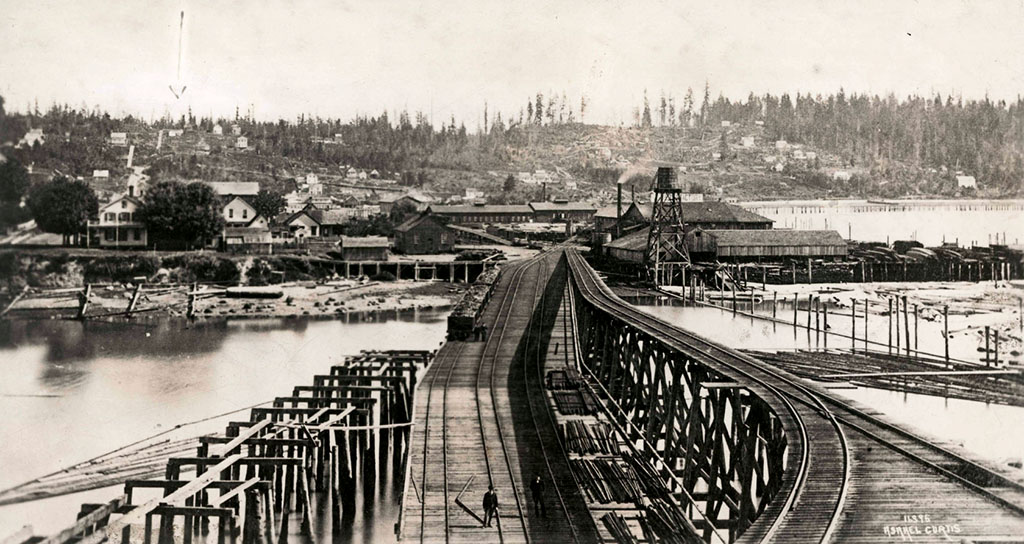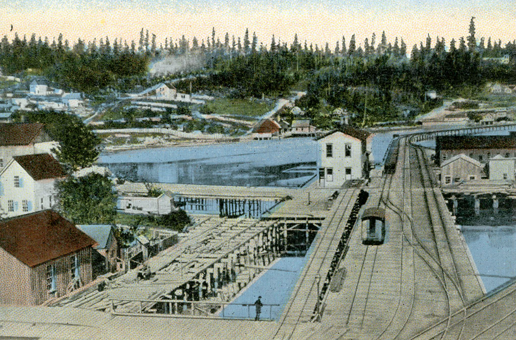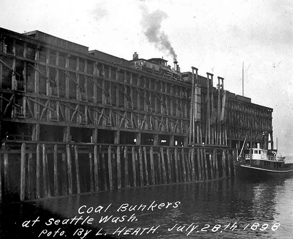 Non-Native people discovered coal in the 1850s. Initially, it had been barged down Lake Washington’s original outlet, the Black River, which flowed to the Duwamish River. Another early method involved transferring coal by tram to the shores of Lake Washington and transporting it by scow, but the hills between the lake and the Seattle waterfront made large-scale coal transport nearly impossible. This problem was solved in 1872, when the Seattle Coal & Transportation Company began operating Seattle’s first railroad, between south Lake Union and coal bunkers at the end of Pike Street.