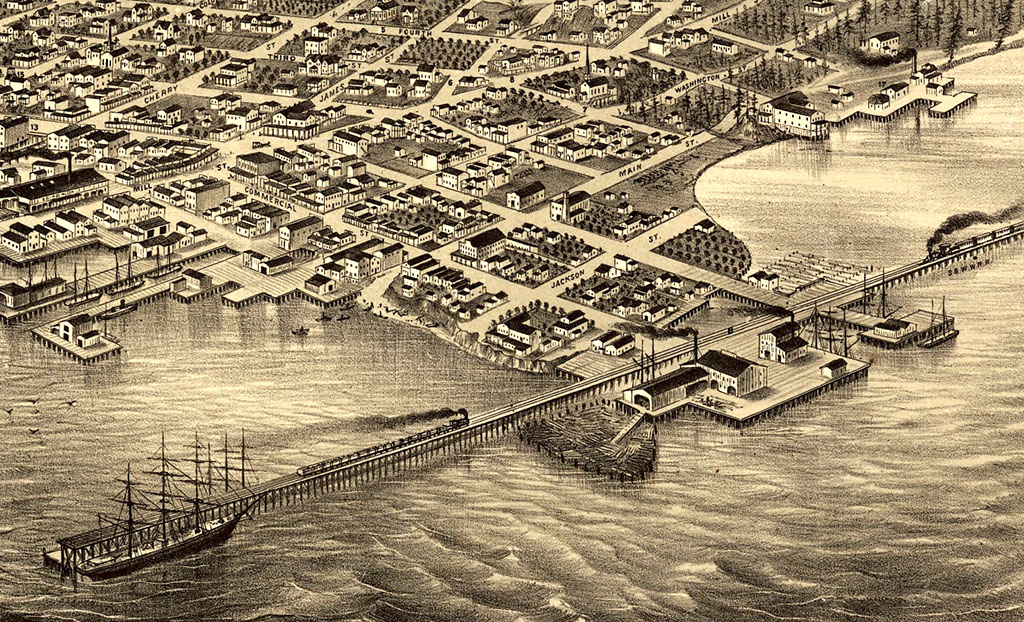 Most of the towns that started around Puget Sound in the last half of the nineteenth century depended on logging as their major source of income. Seattle was like this, too, until the 1870s, when coal supplanted wood. The coal came from the east side of Lake Washington, near the towns of Black Diamond, Carbondale, and Renton, and became central to the Seattle economy with the opening of Seattle’s second railroad, the Seattle & Walla Walla, in 1878. The line never made it to Walla Walla but did reach coal fields around Renton. It ended in Seattle at a two-tiered coal terminal, called a bunker, which facilitated loading at low and high tides. The abundance of coal and the ability to export it helped give Seattle a second important economic resource and made it unusual for the developing towns in Puget Sound.