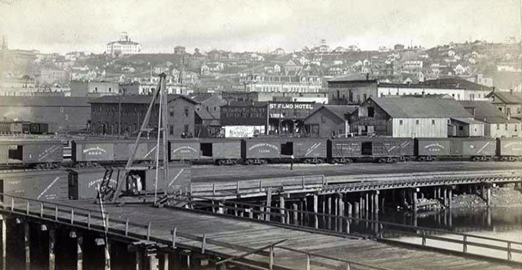 At the time, the bunker on King Street was the southern limit of land in downtown Seattle. The area to the south was part of the Duwamish River tidelands in Elliott Bay, which during high tide was 10 to 15 feet deep in water. When the water ebbed out at low tide, it uncovered an open expanse of mud that stretched from roughly the base of Beacon Hill to West Seattle and south to what is now the Spokane Street Viaduct.