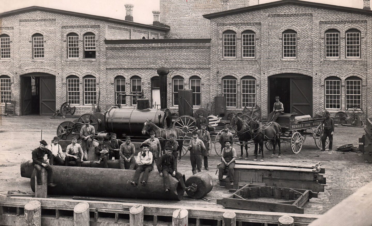 They started one of the very early industries in Everett, the Sumner Iron Works. Their plant was across the Snohomish River near present-day Highway 2, completed on Christmas Day, 1892. At first they made ore cars for the Monte Cristo mines and other mining equipment for Alaskan mines. When Everett’s industries turned to lumber mills, Sumner Iron Works produced sawmill machinery. In 1913, their factory was destroyed in a fire, but months later they completed a new plant on the Everett side of the river near Lowell.