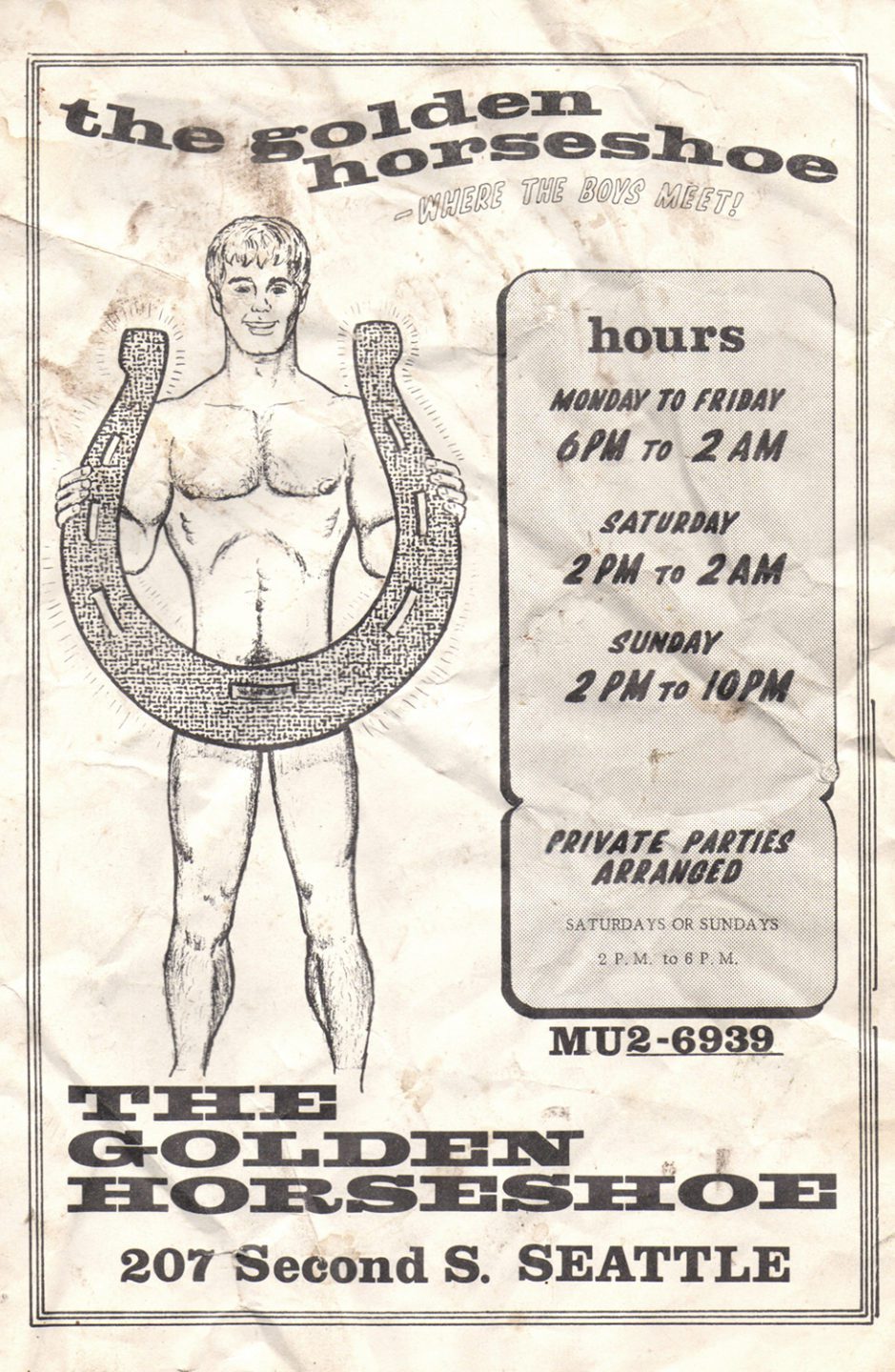 Remember the first stop on the tour, the 611 Tavern? Remember how police told the 611’s co-owner that men couldn’t dance there because they were already dancing other places? One of those places was the Golden Horseshoe Tavern. Often called the Shoe, it opened as Seattle was preparing to host the Century 21 Exposition, better known as the Seattle World’s Fair. Close to 10 million visitors passed through in 1962, and surely some were gay. Maybe a few stepped into the Shoe. If so, they would’ve seen amateur drag shows and theatrical productions that changed every two weeks. But much like his colleague at the 611, Golden Horseshoe co-owner Joe McGonagle had also wondered: Why couldn’t men have a place to dance together?
