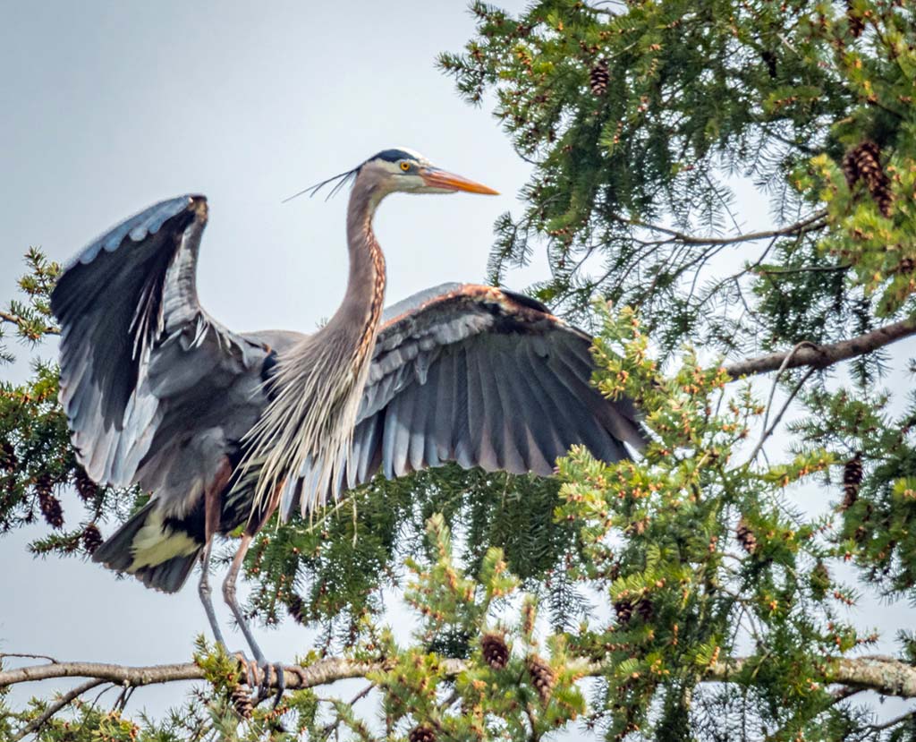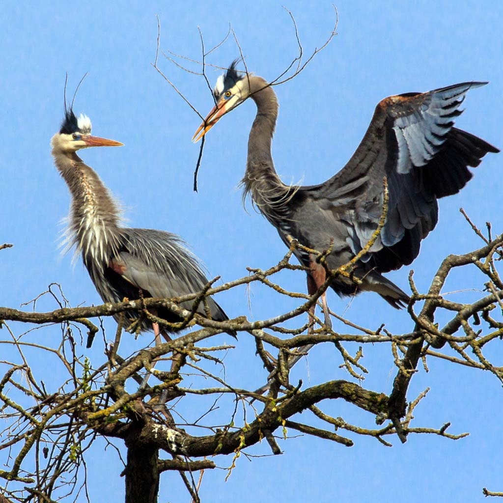 The Great Blue Heron, with its slate-gray body, chestnut and black accents, and very long legs and neck, is the largest heron in North America. In flight it looks enormous, with a six-foot wingspan. Kenmore’s heron rookery includes dozens of nests refurbished each year by returning expectant parents. It is a popular site for bird lovers and photographers during nesting season from mid-February to late July. Bring your binoculars to see the birds up close.
