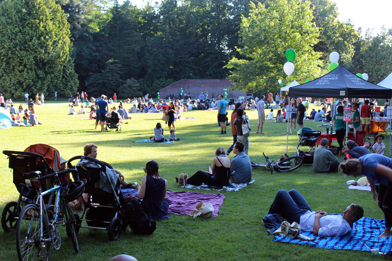The lawns provide a respite from the urban environment. They also create space for gatherings and recreation. On a sunny day, this lawn is full of picnickers, people playing Frisbee, and people walking their dogs.