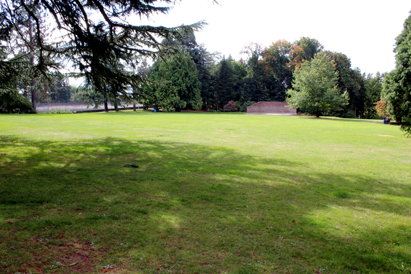 When Olmsted designed Volunteer Park, he placed organized activities — things like playgrounds, a concert grove, and the conservatory — at the north end of the park and beside the main drive, or concourse, along the top of the ridge. In the rest of the park, he laid out vast, sweeping lawns, fringed with planting beds. He called for trees, tall shrubs, and low plants in those planting beds so they would enclose the lawns. The lawn to the west of the concourse has been altered since the park was originally developed. The thick grove of trees that bisects the lawn have been planted over the years for a variety of reasons. Also, the Amphitheater, which can be seen at the far end of the lawn, was built in 1971 and the lawn was regraded to create a bowl for seating.