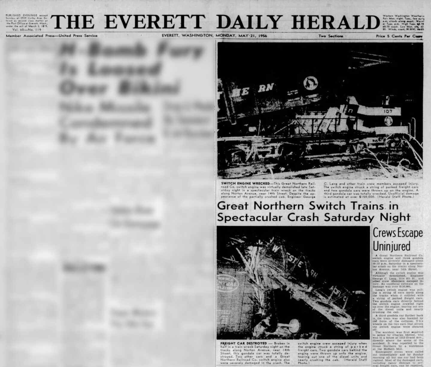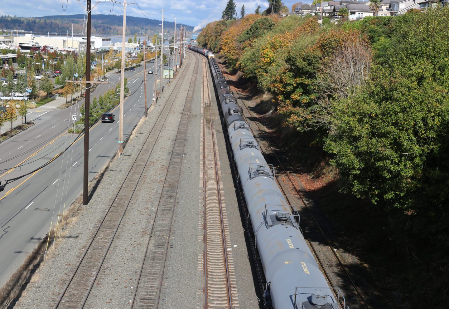 The rails just east of Marine View Drive were formerly the Great Northern Railway Bayside Switchyard. The tracks are now part of the BNSF Railway Company. Rail car switching operations no longer exist here. Today, BNSF primarily uses this area for train stopovers and crew changes for oil trains, coal trains, and mixed-cargo freight trains.