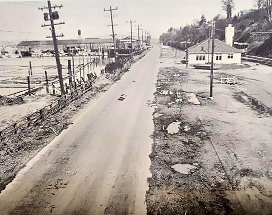 In the sawmill and shingle mill heyday, this stretch of track along the bayside waterfront from 9th Street to Everett Avenue was a beehive of activity. Here, numerous rail sidings and spur lines ran across Norton Avenue (present day Marine View Drive). Great Northern crews and their switch engines moved rail cars in and out of the waterfront mills for shipments of lumber and shingles to markets all over the U.S. This section of track was part of the Coast Line of the Great Northern Railway, the main line between Seattle and Vancouver, B.C.