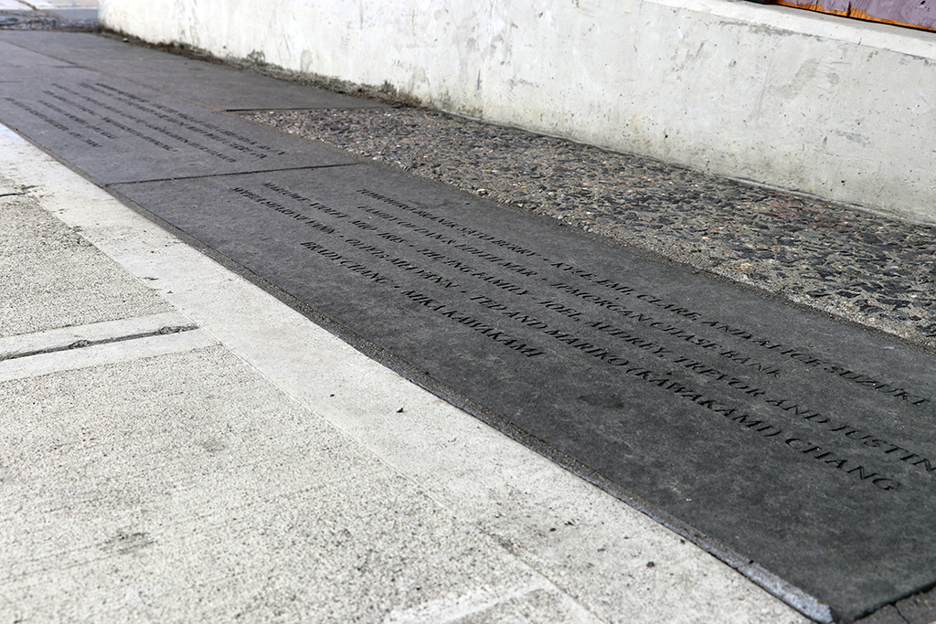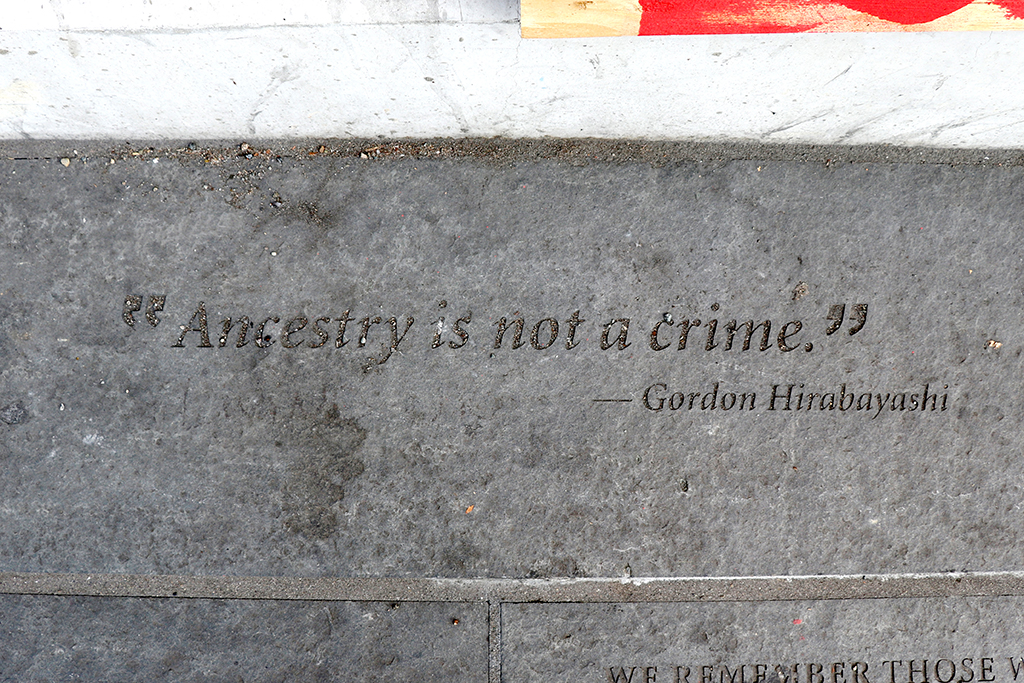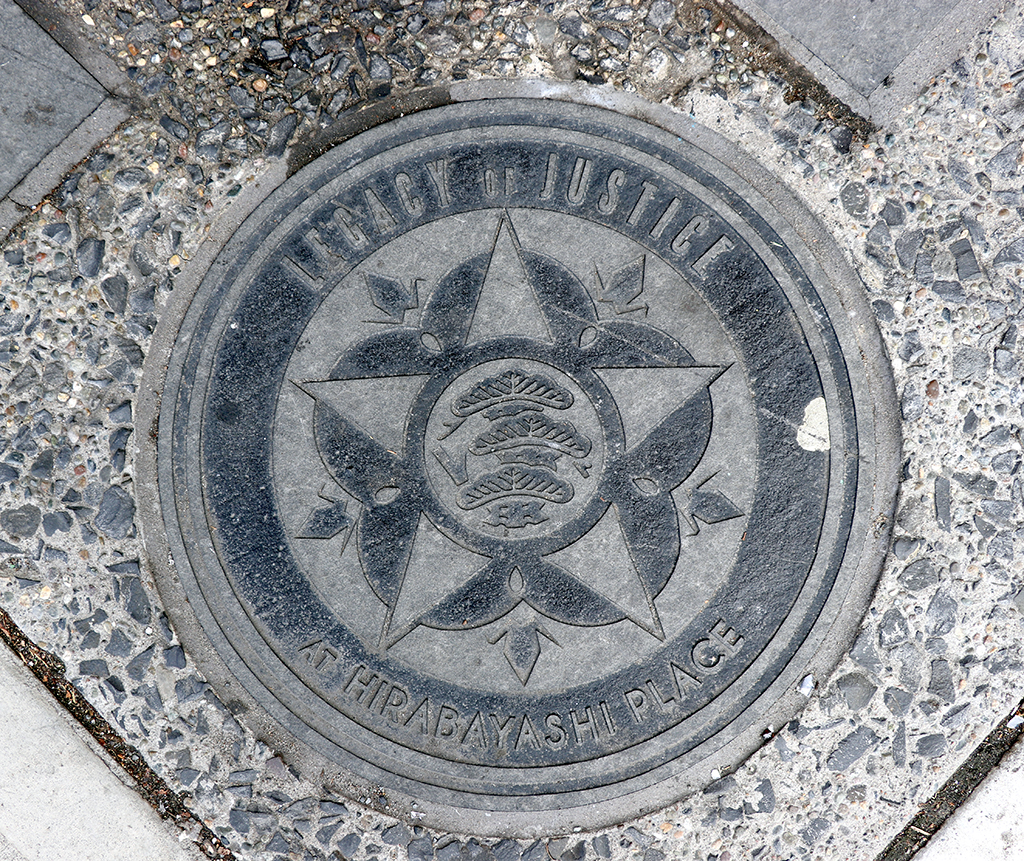 The building’s exterior includes glass panels on columns that tell the story of Japanese American community history by artists Aki Sogabe and Amy Nikaitani. Quotations by Hirabayashi and the names of families and individuals are carved in basalt pavers around the base of the building in remembrance and as statements that affronts to civil liberties must never happen again.
