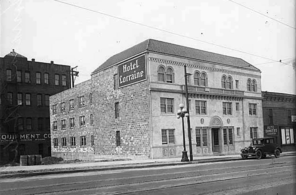 When the movie industry emerged in the early twentieth century, the Belltown neighborhood — thanks to its low density and zoning rules designating it for light industry — became home to myriad film-related businesses. Parts of 2nd and 3rd avenues were known as Film Row, and many of Hollywood’s major studios made Seattle a distribution outpost. The Lorraine Hotel was built in 1925 by modernist architect J. Lister Holmes, and its location made it the film industry’s favorite haunt, a place where showbiz managers, studio representatives, and movie stars stayed. Later renamed the William Tell Hotel, it became low-income housing and is today’s City Hostel. Also surviving from the Film Row era are the RKO Building (2312-2316 2nd Avenue) and the MGM/Loews building (2331 2nd Avenue).