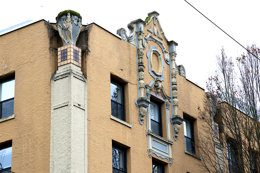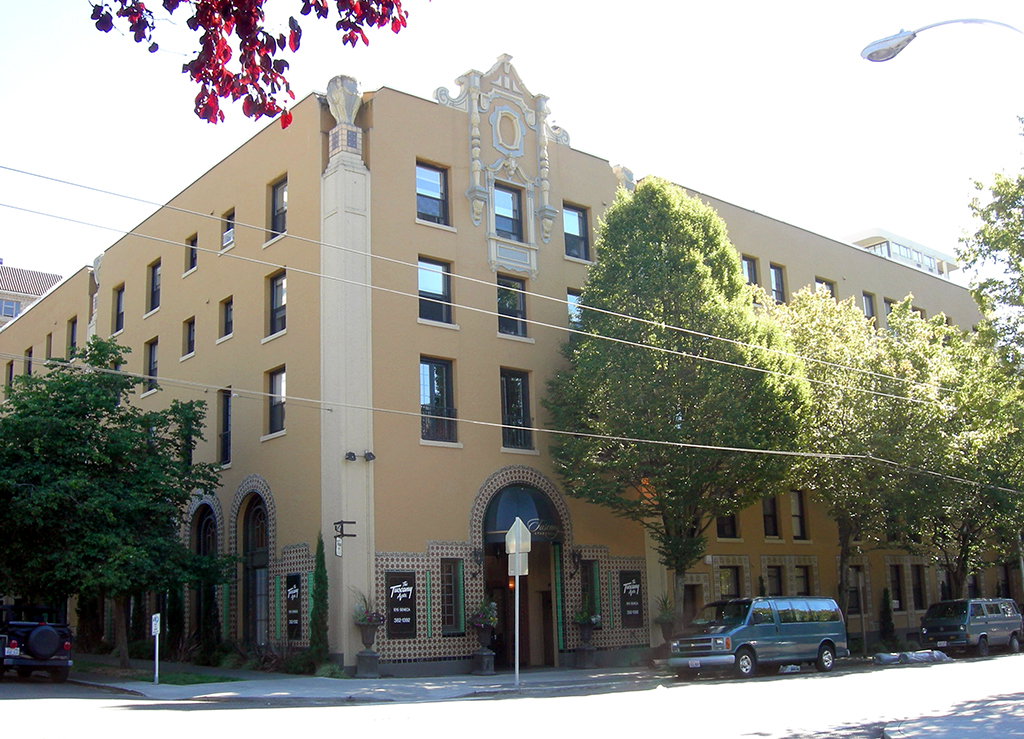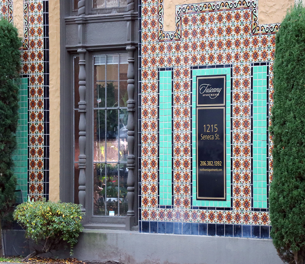 Continue walking west along Seneca Street to view another historic apartment building at Summit Avenue. The rain and cloud filled skies of the Northwest inspired the well-to-do of Seattle to make extended winter trips to Southern California. By the mid-1920s, Spanish Colonial revival style homes and public buildings became a way to recall the sunnier climate of Santa Barbara, Hollywood, and San Diego.