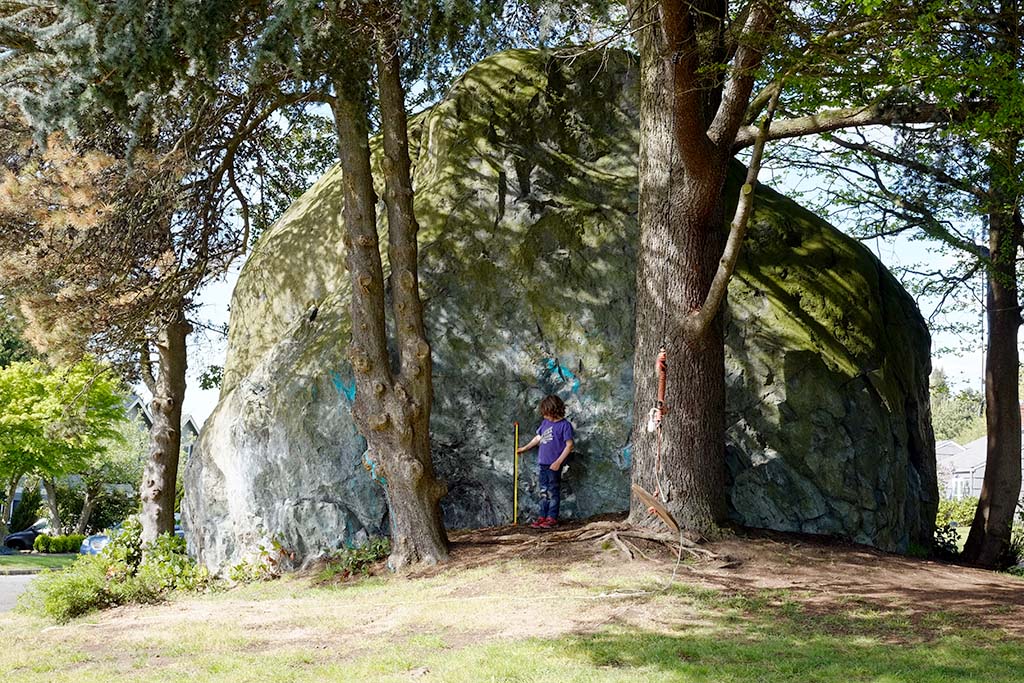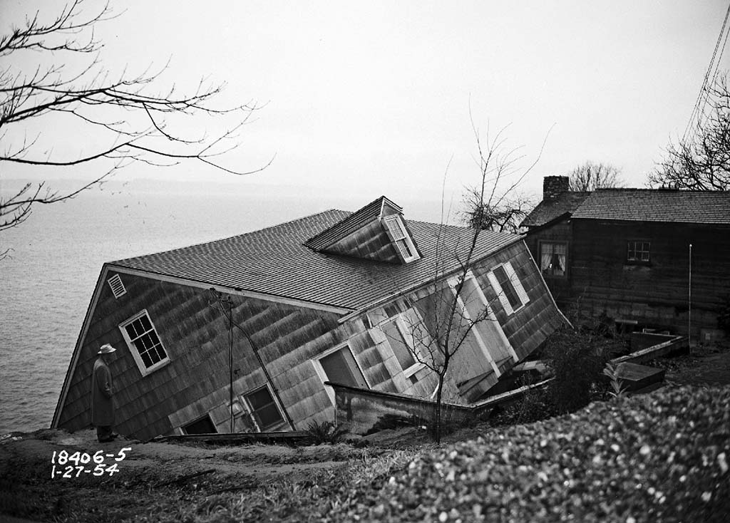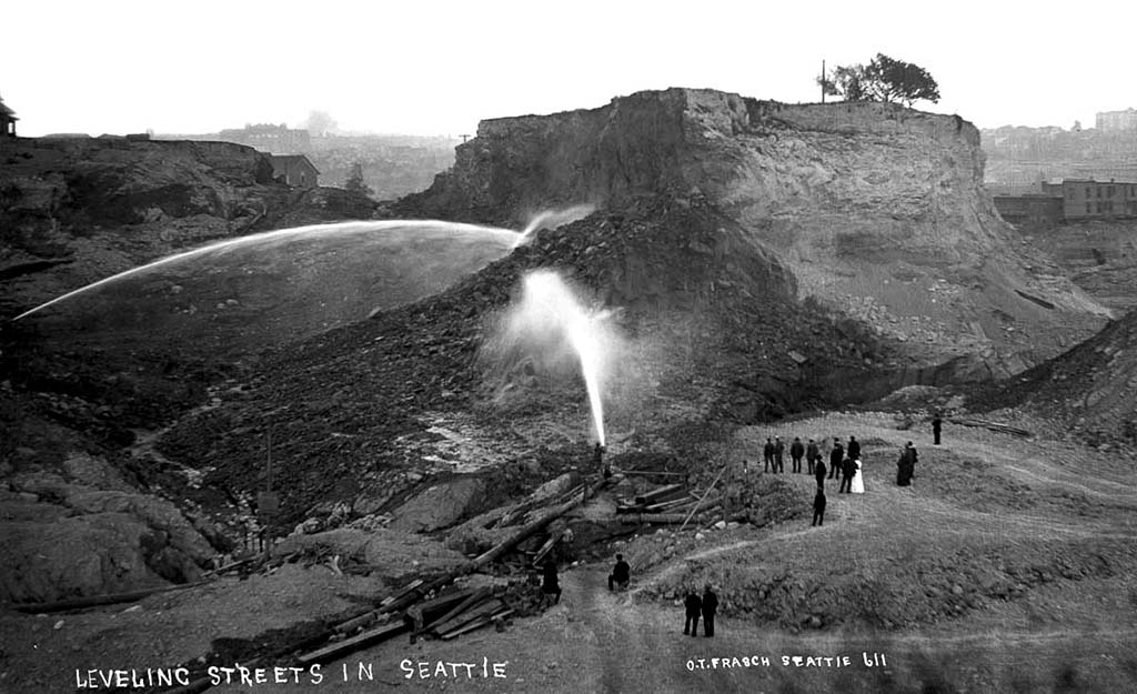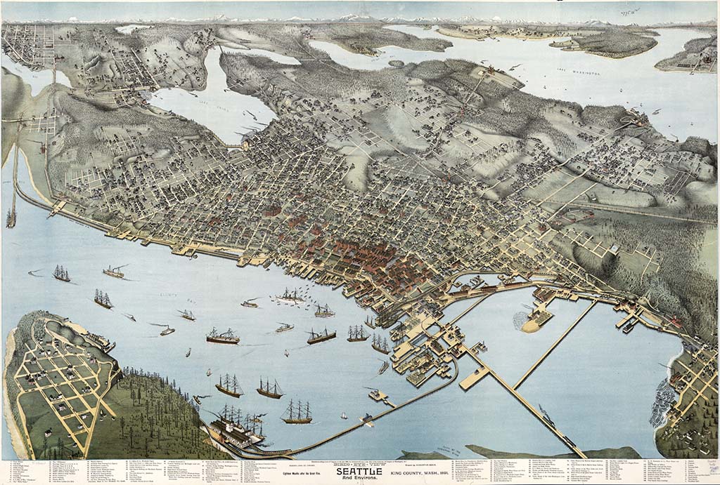 Three large scale landscape features resulted from the glacier. First is the sediment deposited: if you cut into any hill in Seattle you will see a roughly 100 foot thick layer of clay topped by a twice as deep layer of gravel and sand and a less than 30 foot thick, culminating cap of mixed sediments. The second is how the Puget lobe acted as a giant rake scraping the land into a series of parallel troughs and ridges: the city’s north-south trending hills and valleys. And, finally, great rivers running under the ice carved out the deep gouges now filled by Puget Sound, Lake Washington, and Lake Sammamish.