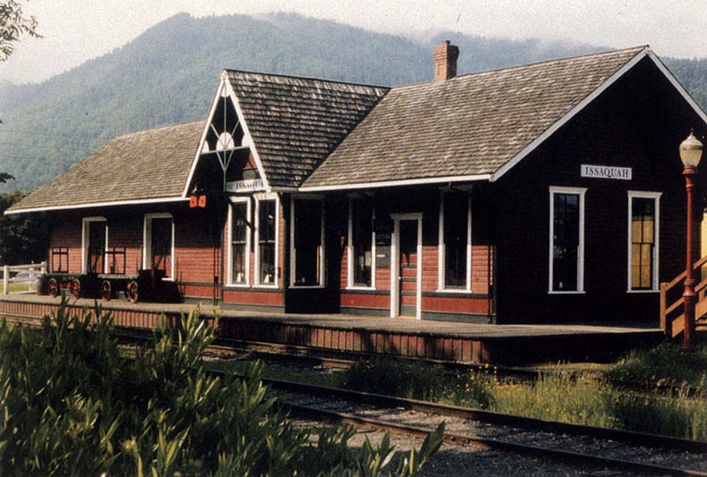 The Seattle, Lake Shore and Eastern Railway arrived in Issaquah in 1888, and a depot with the same name — but more commonly known as the Issaquah Depot — was built in 1889. The railroad’s arrival kick-started Issaquah’s transition from a tiny hop-growing town to a not-so-tiny town that soon became known for coal mining and logging. Operating from the depot, the railroad hauled thousands of tons of coal and logs a year and also made it possible for passengers to make a round trip to Seattle in just one day. The depot became so vital to Issaquah commerce that for a time it served as the business center of town.