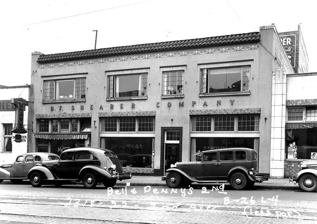 As new-fangled loudspeaker systems first emerged in the mid-1920s, the silent movie era quickly morphed into the “talkie” era of films with soundtracks — and the theater industry boomed. It was 1926 when B.F. Shearer founded his namesake B.F. Shearer Company in Seattle in order to supply theaters with furnishings including carpets, seats, drapes, stage curtains and lighting. Shearer’s office was in a new building at 2318 2nd Avenue, right at the center of Seattle’s “Film Row” district. His factory — which included a wood-shop, electrical shop, research library, and a multi-story tower for manufacturing stage curtains — took up much of the rest of the 2300 block of Film Row. The Seattle Times reported that Shearer built up a workforce that included “artists, designers, cabinetmakers, scenery painters, upholsterers, architectural decorators, precision mechanics, seamstresses, [and] drapers.”