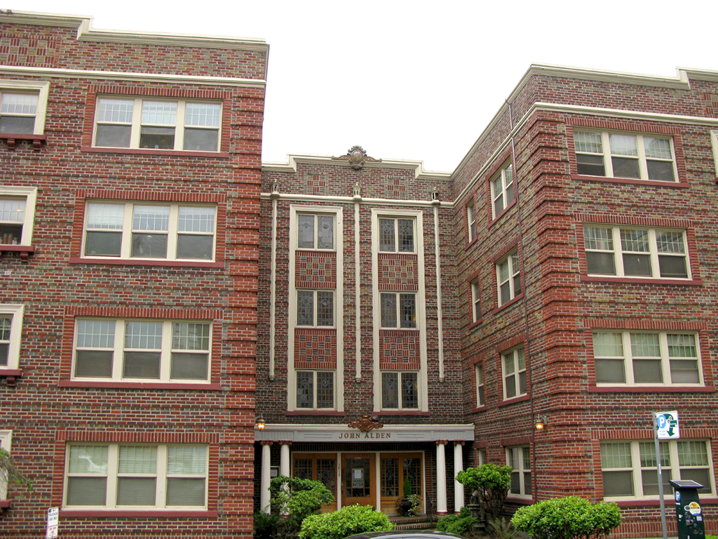 One prominent architect, Harry E. Hudson, left his signature on many of the First Hill apartments built during the 1920s. They are easily recognized by their names, as Hudson, a transplant from the Northeast, named his buildings after figures of New England history and literature – John Alden, Paul Revere, Ralph Waldo Emerson, and James Russell Lowell. Working with his brother John, a builder, the Hudson brothers created the plans for the Paul Revere and the John Alden, two buildings almost identical in plan and located back-to-back on adjacent sites. The brothers incorporated “the spirit of Colonial America in both structures,” reported the Seattle Times, July 20, 1924.