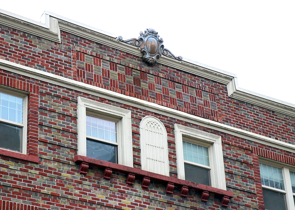 The four-story, U-shaped John Alden is notable for its brick detailing with brighter colored brick as ornamentation. Cream colored terra cotta is used for cornice and coping and arched panels between windows in the center bay. The entry bay is more ornate, with a narrow portico supported by four columns, window surrounds and pilasters and a shield design on the parapet. The spandrels have a parquet pattern in varying shades of red bricks. The doorway displays sidelights with leaded art glass medallions of ships, pilgrims, and Indians on the shore as well as art glass windows in the lobby depicting the Mayflower leaving Plymouth, England and arriving in Massachusetts.