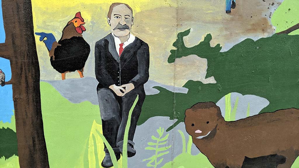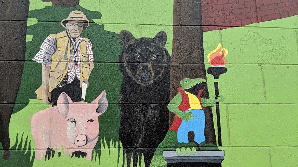 — This gentleman is a Kenmore resident who was known to walk around Kenmore taking photos. The black bear represents the bear sightings we have periodically in this area. The crocodile represents the statue that was formerly located next to the old Kenmore stone business called Crocodile Rocks. The pig represents the animals that were raised on the Inglewood Golf Club grounds.