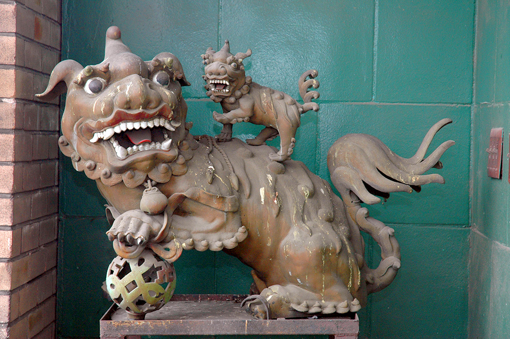 New American Hotel/Bing Kung Tong Building: This Thompson and Thompson hotel was built in 1916 for the Atlas Investment Company that included the Bing Kung Association that still owns the building. The hotel included 91-single rooms and a meeting hall for the association and Chinese Masons that is visible on the fourth floor at the southeast corner of the building. Like all family, district, or tong association meeting rooms, the Bing Kung hall was in an auspicious location at the top floor of the building. The importance of the interior space is immediately visible on the exterior for its detailed decoration and recessed balcony. The balcony includes a terracotta balustrade, stained glass paneled windows, and a tiled canopy. Terracotta is also visible in the decorative inset panel above the balcony that displays the symbol of the Masons.