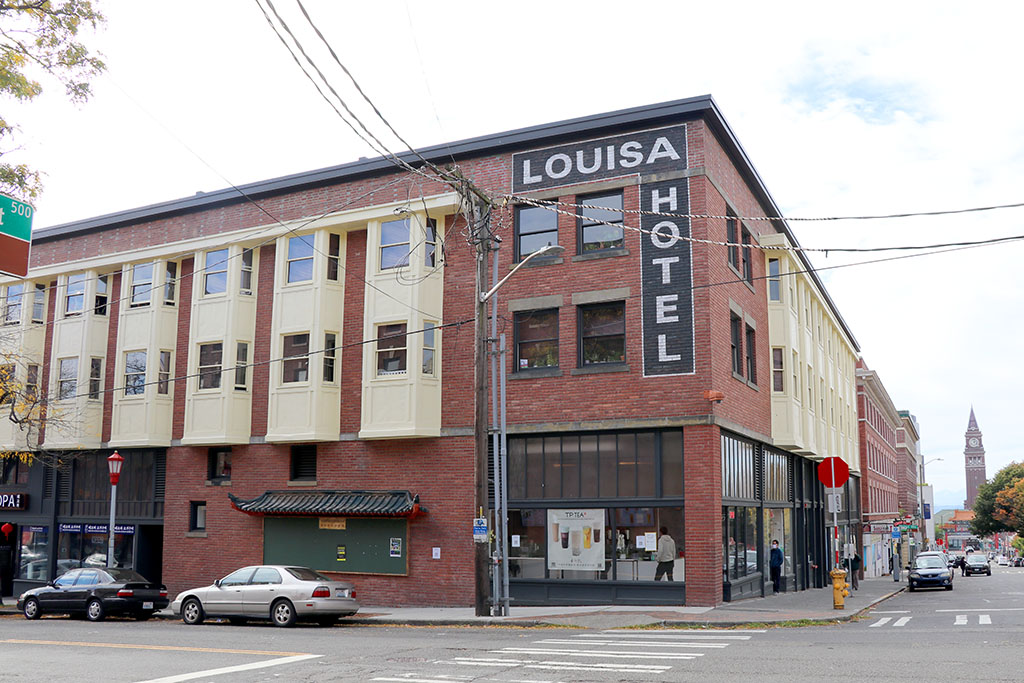 Louisa Hotel: Originally known as the Hudson Hotel when it opened in 1909, the Louisa Hotel is the most recently restored SRO building in the CID neighborhood. Its original 149 rooms were renovated as 84-workforce studio and 1-bedroom units. The building is the only historic hotel in the district that has two-story window bays. As early as 1916, the basement of the hotel was leased as the Sky-Hi Club, a gambling operation that decorated the stairwells and walls with paintings of elegant women patrons wearing long evening dresses and furs and men wearing top hats and tuxedos. The building also contained the Wah Mee Club, a private gambling club with its main entrance at the east side of the building fronting Maynard Alley. In 1983, the Wah Mee became the site of a robbery and the worst mass slaying in Seattle’s history with the death of thirteen patrons. On Christmas Eve 2013, the hotel sustained a fire that destroyed the eastern half of the building. The restoration of the building was completed in 2019 and rebuilt to duplicate the exterior features that were original to the building. The basement wall paintings have been retained and preserved.