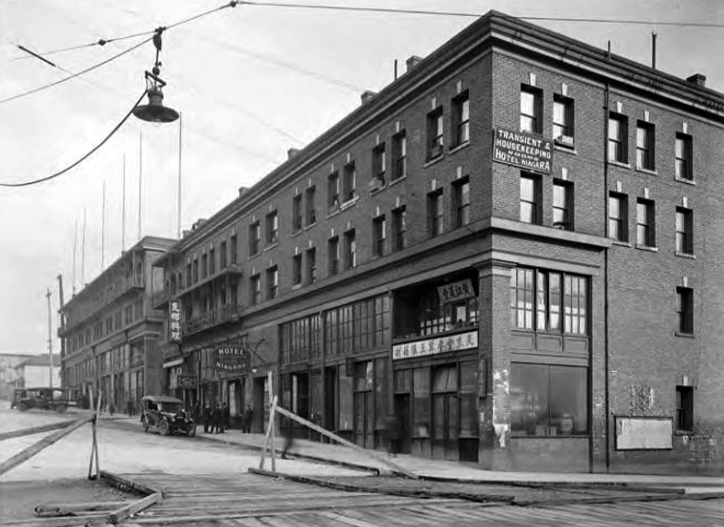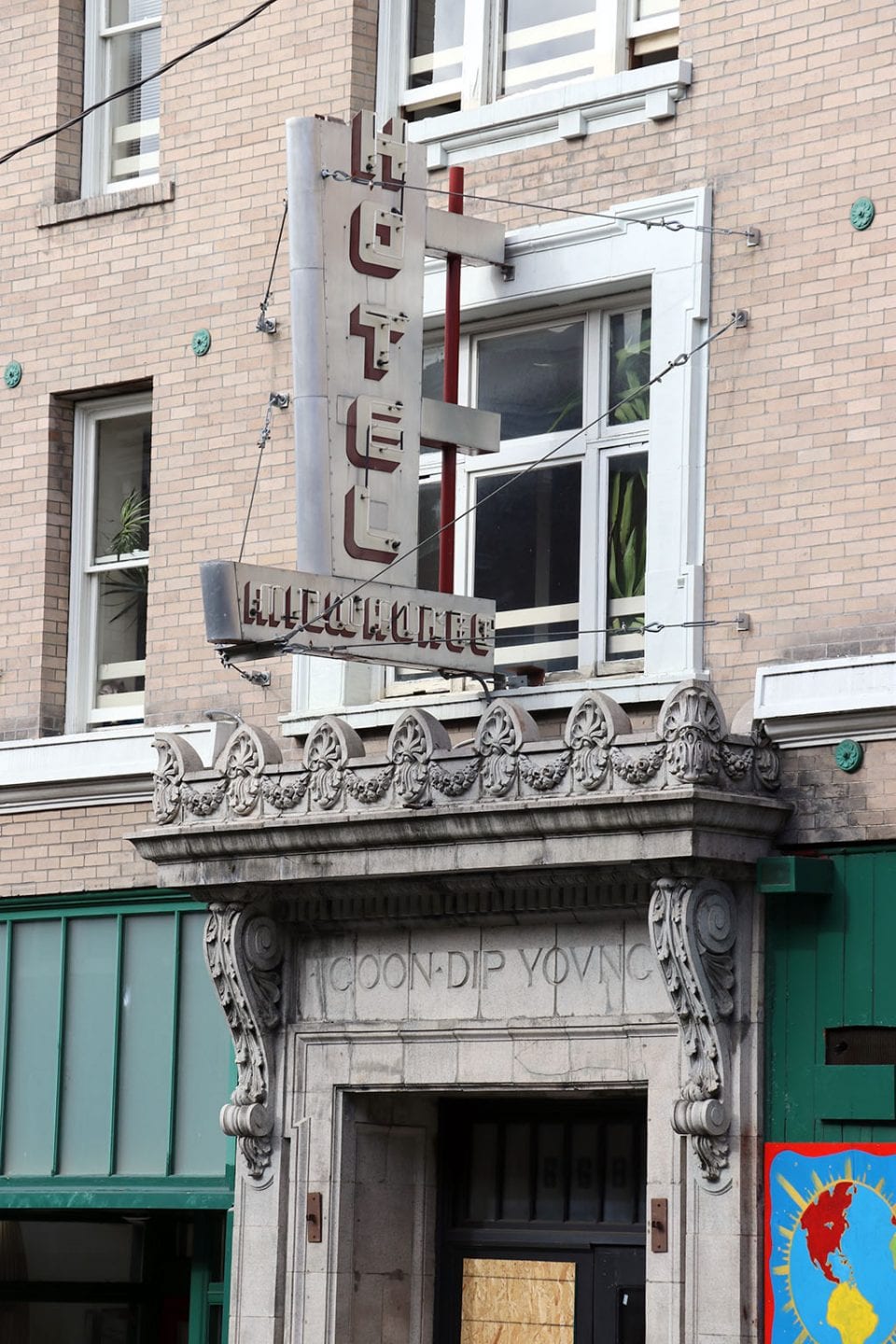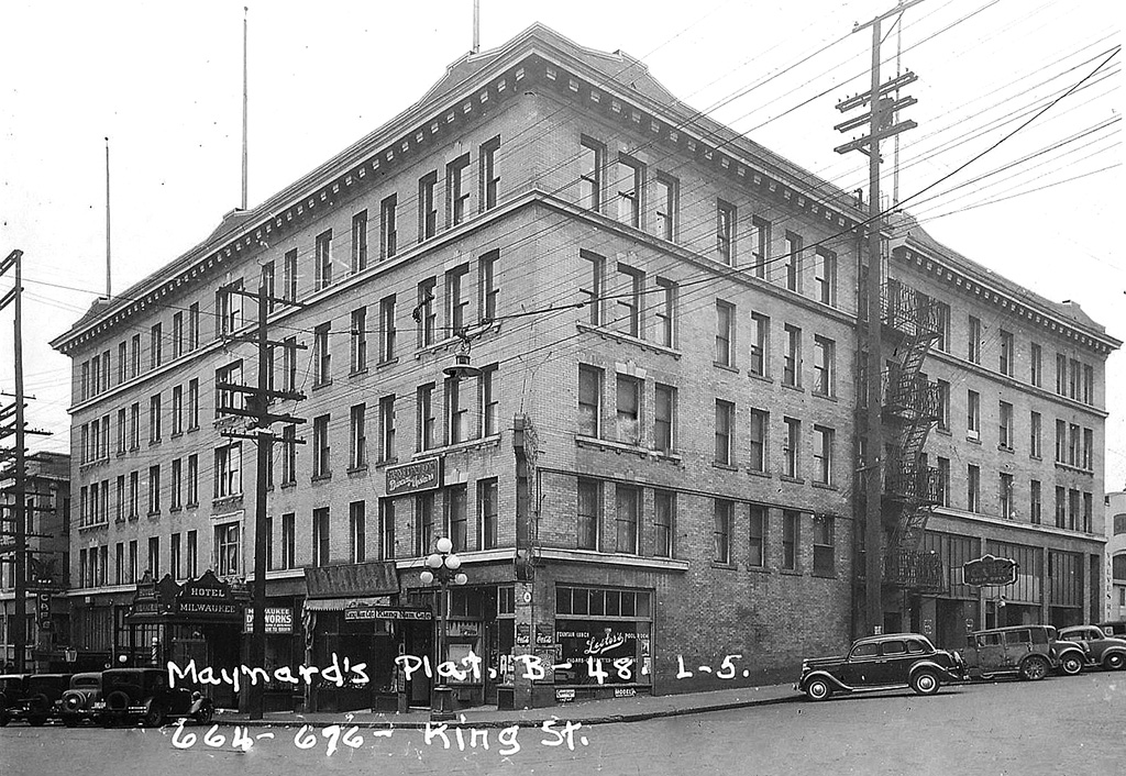 Designed by Thompson and Thompson, the Milwaukee Hotel was built in 1911 for Chinese entrepreneur Goon Dip. As an immigrant from Guangdong Province, Goon had spent the early years of his time in America working and learning about labor contracting and hotel management and ownership in Portland. Goon’s early business partnerships, investments, and language skills ultimately earned him a fortune that he used for real estate development. His status as a successful businessman and his proficiency in English earned Goon the position as Honorary Chinese Consul for Washington, Idaho, and Alaska in 1909 with the Consul headquarters in Seattle. Goon’s Milwaukee building was a project that included nine commercial storefronts and served three residential purposes. It was a hotel if entered from King Street, as apartments if accessing the 7th Avenue South entrance, and served Consul Goon and his family as their personal residence. The 150-room SRO hotel made no luxurious provisions for accommodating the Goon family and like other families who lived in SROs in the district, a series of rooms could be rented. Like the Alps Hotel one block to the west, the Milwaukee Hotel was designed with an elevator and employed a staff person to operate it. The Milwaukee CafĂ© was located on the mezzanine level of the building as another of Goon’s business ventures. The building was renovated into studio, one-, and two-bedroom apartment in 2010.