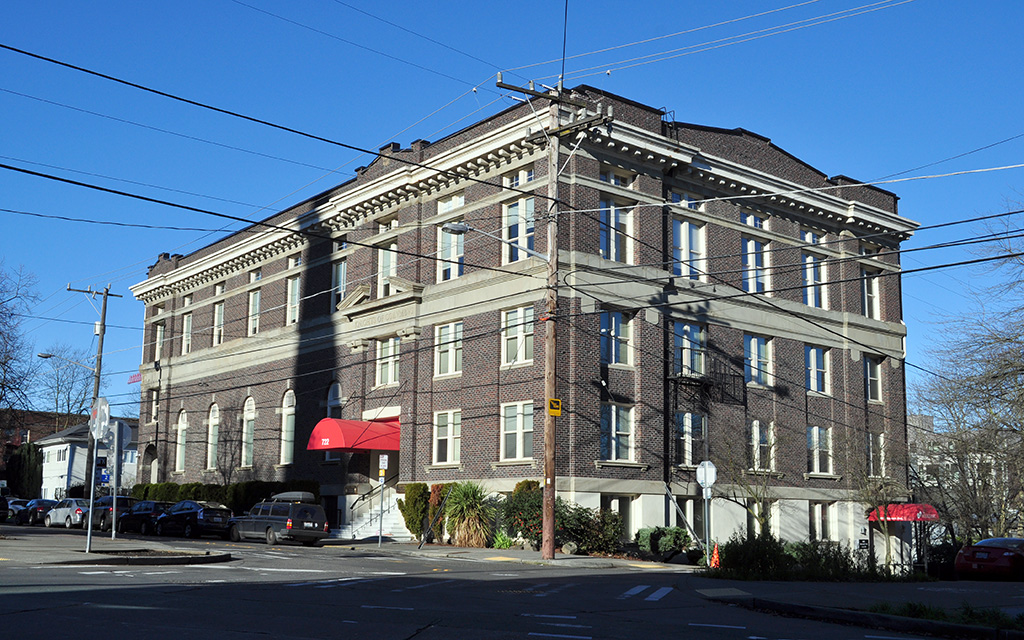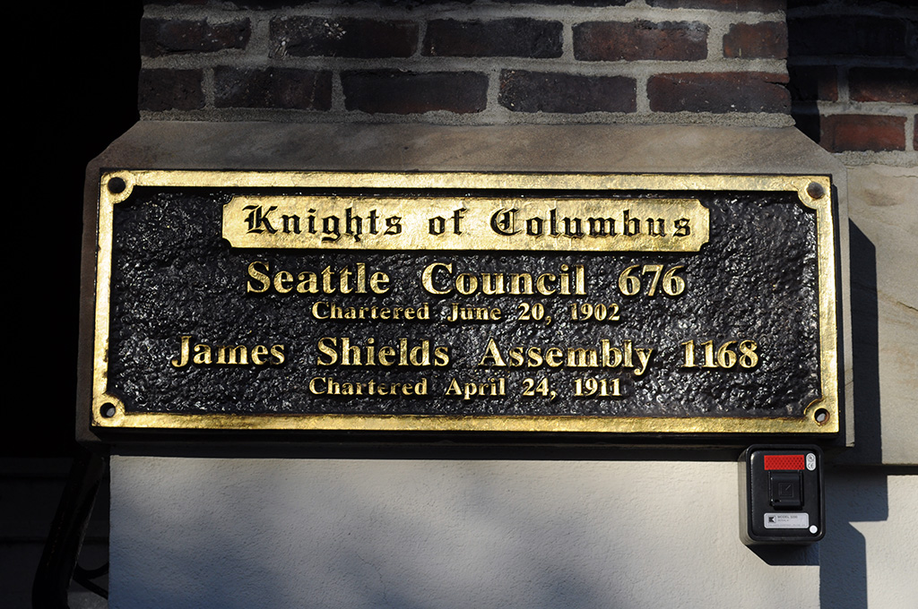 Across the street from the Phillips House is the Knights of Columbus building. This solid four-story clinker brick structure ornamented with arched windows and classical dentils was home to the Seattle Council of this Catholic fraternal organization for over 100 years. Designed by St. Louis architect F. W. Bohne, Bishop O’Dea laid the cornerstone in April 1913. The Knights of Columbus celebrated the building’s completion with a ball for several hundred guests, hosted in the building’s expansive first floor ballroom, which is visible behind the eight-foot-tall arched windows. Before the city constructed community field houses and gyms, the Knights gymnasium facility in the basement was probably the best known and most used in the city. The now obsolete swimming pool, also in the basement, was last used by Coast Guardsmen during World War II. The property was sold by the Knights in 2018 and is slated for adaptive reuse. The building is a Seattle Landmark and listed in the National Register of Historic Places.