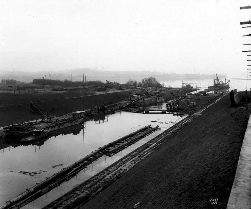 The shoreline began to change as industry moved into the area, particularly sawmills such as Lake Union Lumber and Manufacturing and Western Mill. They initially exploited the forests around the lake then with the 1887 creation of a narrow channel to Lake Washington, complete with locks, and obtained trees floated in from the larger lake. As part of the process, the mills created piles of sawdust and debris, which they dumped, along with a few derelict boats, into Lake Union, slowly pushing the shoreline north. It reached its modern location in the middle of the twentieth century with the addition of material from the construction of the Naval Reserve, now the Museum of History and Industry, and Interstate 5. The lake level did not change with construction of the Lake Washington Ship Canal.