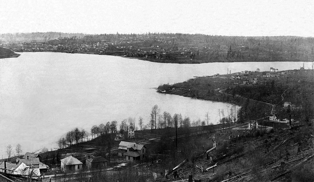 If you had arrived at this location in the 1850s, the landscape would obviously look little like it does today. An early survey noted “low wet and Brushy Banks and fallen trees extend into the water. Timber around the Lake, fir, cedar, hemlock, Maple-Alder. Undergrowth Hazel, Willow, Crabapple, Salmon Berry, Gooseberry, Hard-Hack, fern, Salal, nettle and various Kinds of briers.” The biggest Douglas firs had diameters of 80 inches.