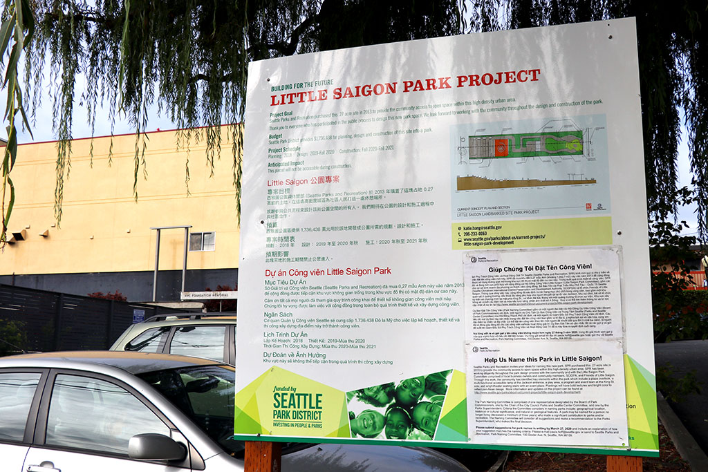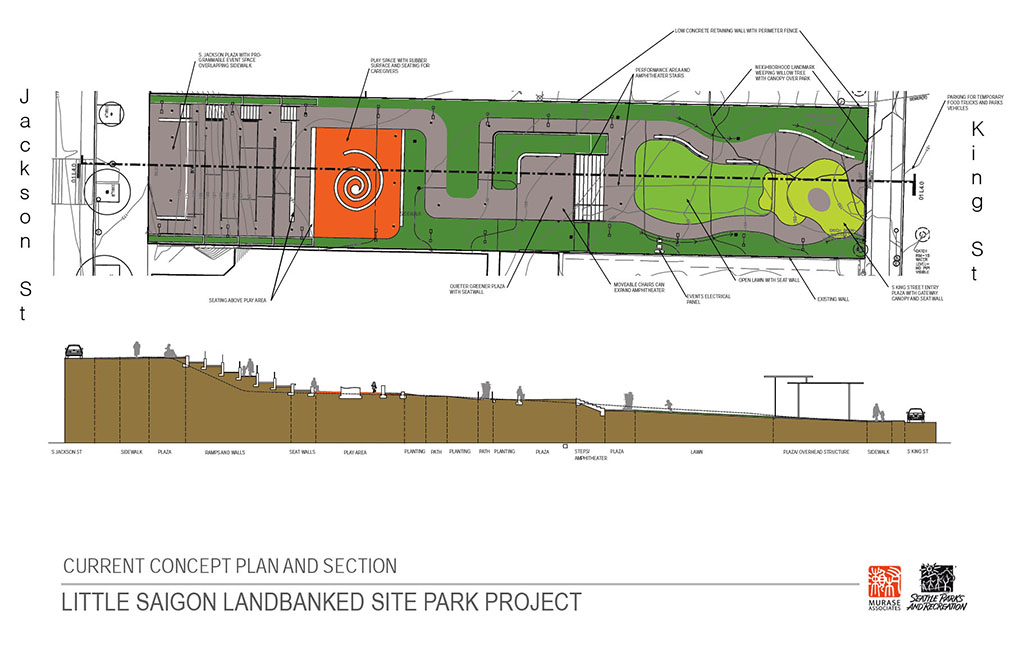 In 2011, the Seattle Parks Department, Friends of Little Saigon, and interested community members identified an area of the community that would provide open space for the Little Saigon neighborhood. This .27-acre area will redevelop a portion of the city block that was underutilized as a parking lot. The design amenities of the new park were identified through a series of community meetings with the landscape architecture firm of Murase Associates. The final design includes passive and active green lawns, an event plaza, a central pathway that includes accessibility to park amenities, and seating areas. The new park will take advantage of the slope between Jackson and King Streets by incorporating an amphitheater with stepped seating and movable chairs. An open competition was held for public art designs and for the submission of possible names for the new park; both of which will be announced prior to construction. Construction of the park is scheduled to begin in the winter 2020.