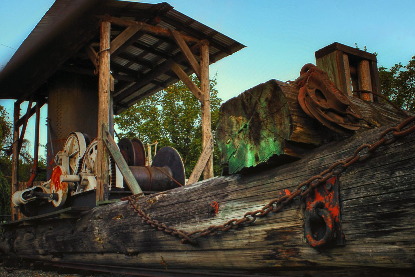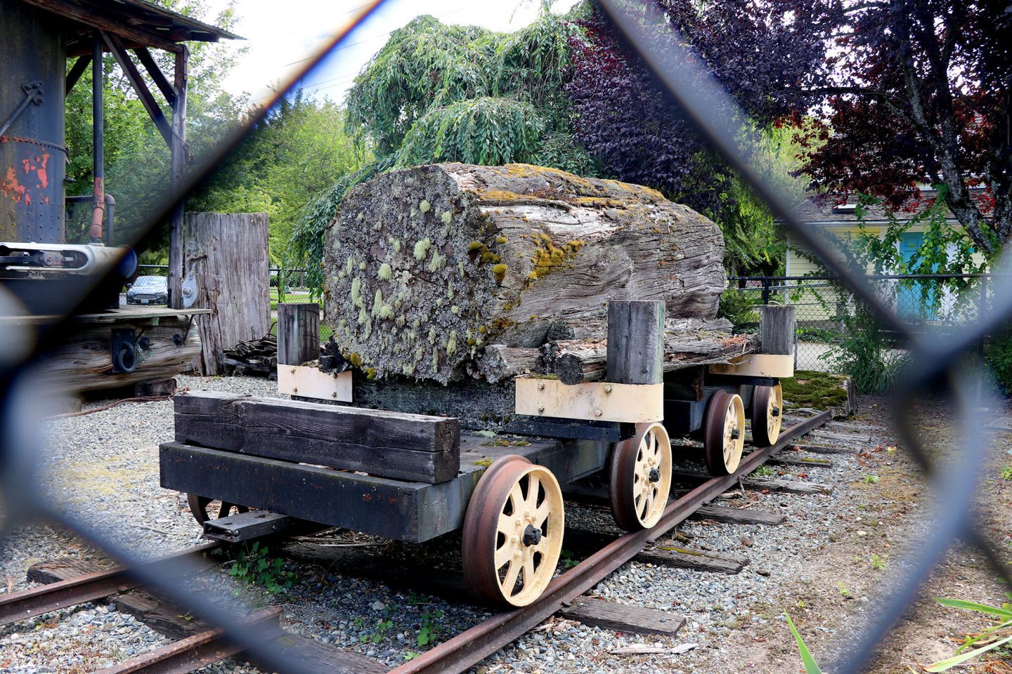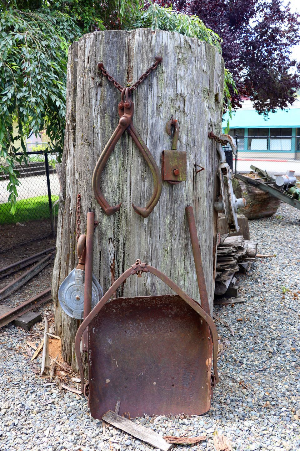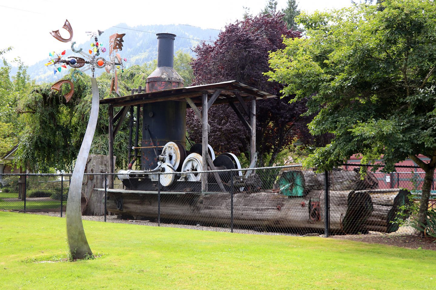 Along with coal mining, logging was one of the catalysts for Issaquah’s growth during the late nineteenth and early twentieth centuries, and the logging history display in Issaquah’s “Preservation Park” (it is not an official city park) reflects this. Built in the 1990s, the display is maintained by the Issaquah Historical Society. A logging engine is the centerpiece of the display. This engine, more commonly known a hundred years ago as a donkey engine or a steam donkey, could move logs for up to a mile. A steam boiler on top of the engine provided power, and one end of a cable would be attached to a winch on the engine, while the other end would be tied to a log to move or “skid” it toward the engine, which was usually placed conveniently near a loading site. When it came time to move the engine to another site, one end of the cable would be tied to a tree at or near the next desired location and the donkey would pull itself along on log skids.
