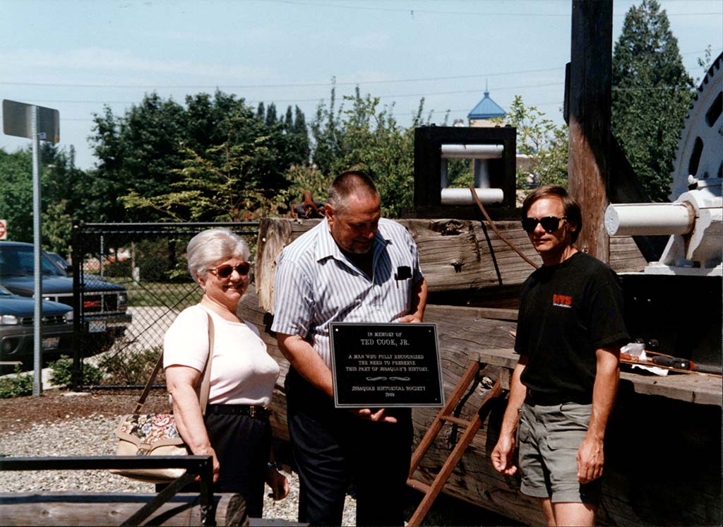 The engine on display was built between 1895 and 1910 by Puget Sound Iron and Steel Works near Tacoma. It was found in 1987 near Enumclaw on land owned by the Weyerhaeuser Company, and moving it to Issaquah proved to be no easy task. Volunteers spent four years traveling to the site, taking apart the larger pieces, and hauling them to Issaquah before finally taking what was left to the site on a flatbed truck. It was rebuilt during the 1990s on a small parcel of land next to the Issaquah Community Center, much to the chagrin of some city officials, who thought the engine (still covered with rust) didn’t belong there. But the engine stayed, and today serves as a prominent reminder of Issaquah’s logging past.