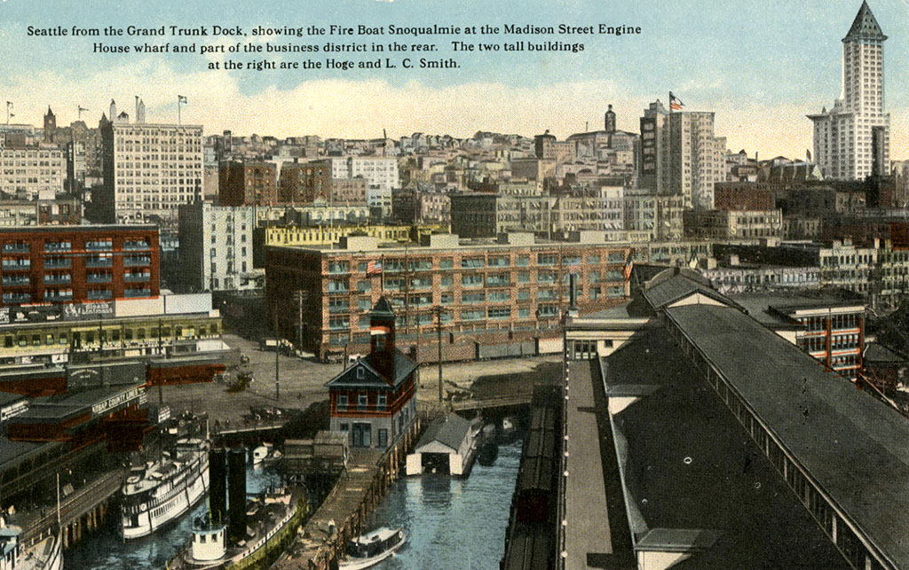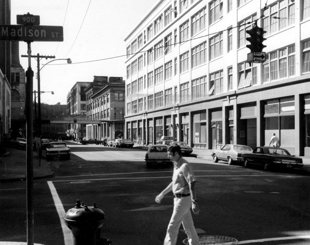 Western Avenue was once Seattle’s warehouse district. Much of the produce and other goods coming into the piers along Railroad Avenue (now Alaskan Way) from around Puget Sound passed through buildings like the Maritime Building on the northwest corner and others between Yesler Way and Union Street like the National Building at 1008 Western Avenue, the Carstens Building at 815 Western Avenue, and the Polson Building at 61 Columbia Street.