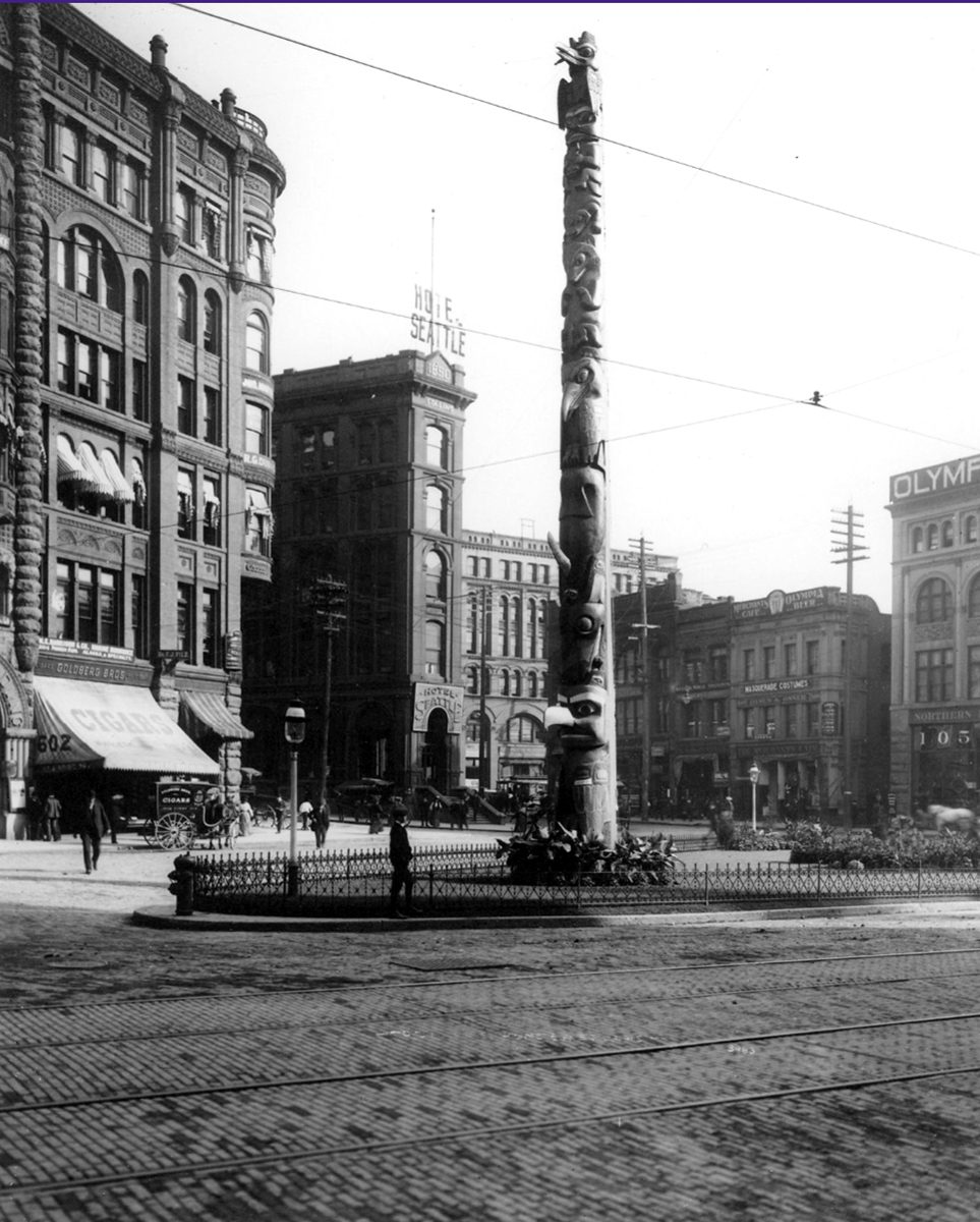 With a history predating the Great Seattle Fire of July 6, 1889, the Merchant’s Café was founded by John Hall Sanderson in a two-story wooden building typical for this neighborhood. After the fire it was quickly rebuilt in brick as part of the Sanderson Block Building. The new building featured a liquor emporium and café at street level and two floors of a hotel above. Sold in 1892 to Charles Osner, it was recast as the Merchants Exchange Saloon, a favorite dining spot for businessmen. Simultaneously, the upstairs rooms served as a brothel throughout the Gold Rush years.