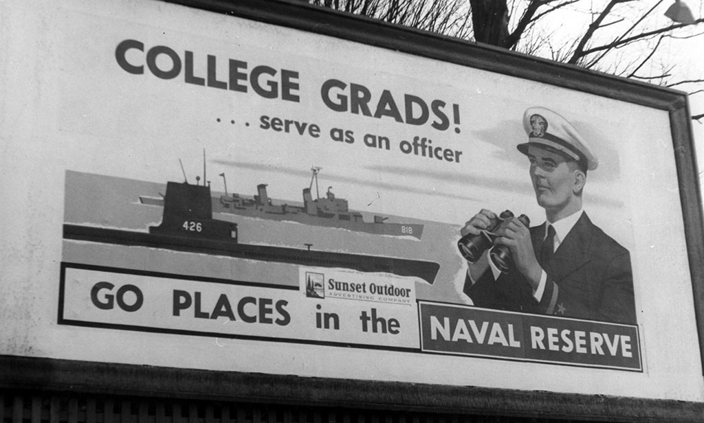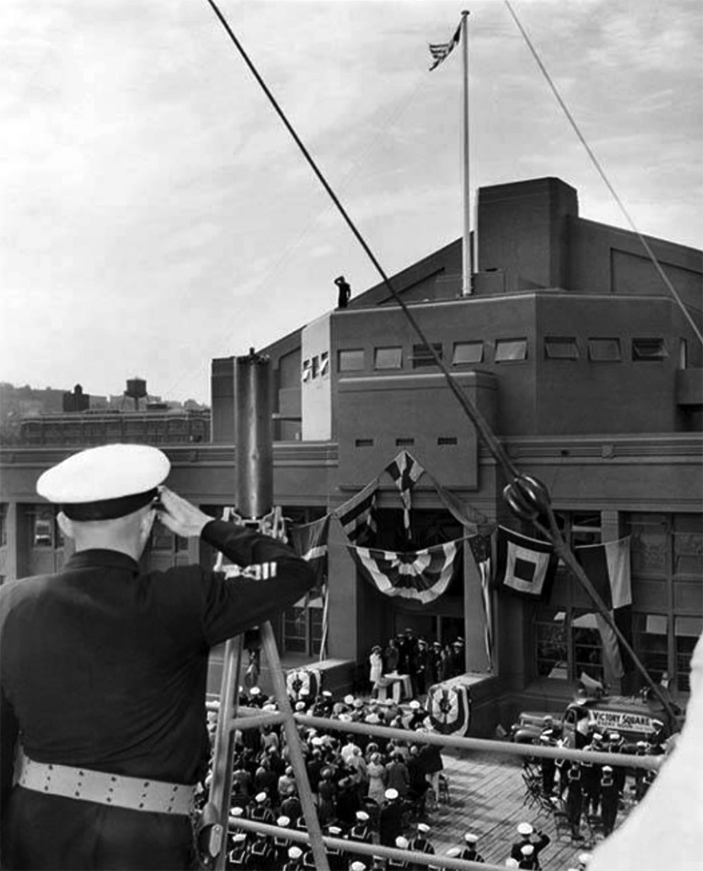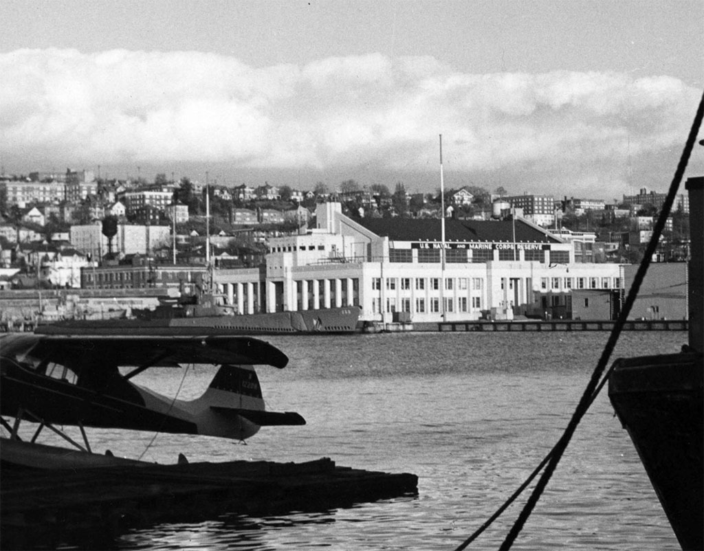 Initially planned and designed in 1937, the Naval Reserve Armory opened on July 4, 1942. The city of Seattle Landmarks nomination notes the building’s curious combination of Art Deco, which emphasized verticality and geometric motifs, and Moderne, which favored horizontal forms and simply shapes. At its peak use during World War II, the site contained 25 buildings, including messhalls, a Women Accepted for Voluntary Emergency Service barracks, and a chapel, and could accommodate 800 trainees who would become range finders, welders, gyro-compass operators, and ammunition handlers.